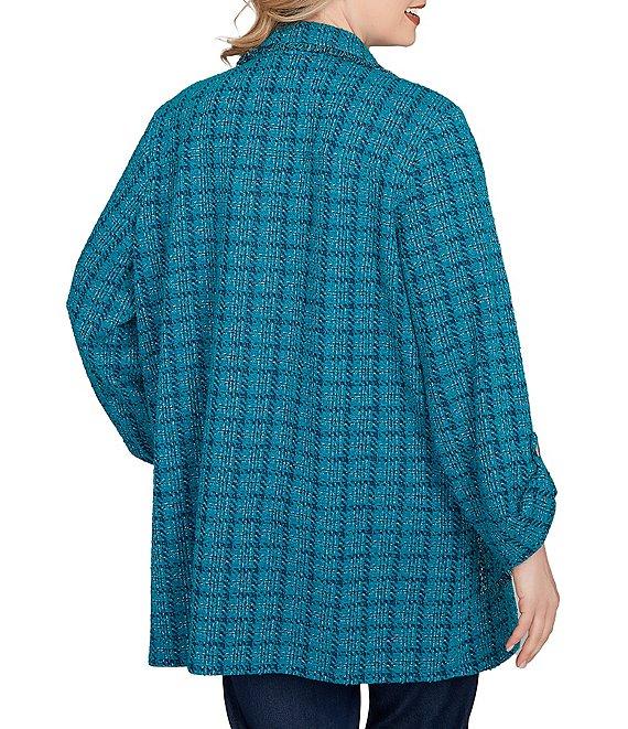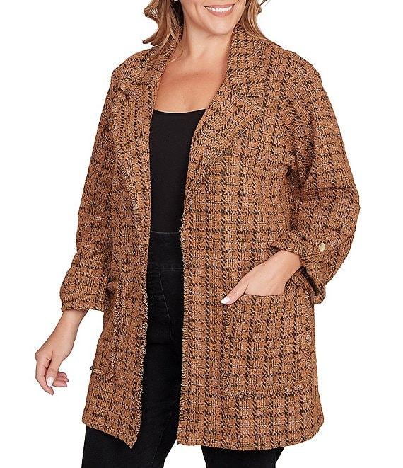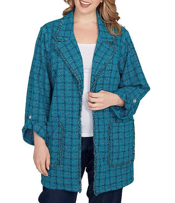 From Ruby Rd. Plus, this jacket features: Tweed plaid fabrication Notch lapel collar Long roll-tab sleeves with button closure Two front patch pockets Fringe detail along the edges Straight hem Open-front; no closure Approx. 32" length Polyester/cotton/spandex/metallic Imported. This stylish tweed boucle jacket is made from a yarn-dyed plaid fabric with a subtle gold metallic yarn, adding a touch of shine to your look. Featuring a notch collar and an open front, it's designed with fringe detail along the edges for a chic, textured finish. The 3/4 roll-tab sleeves and two patch pockets complete the look, making it perfect for layering over both casual and dressier outfits.