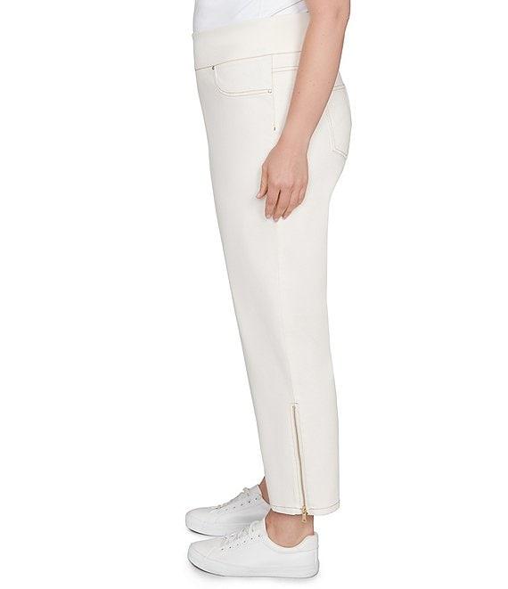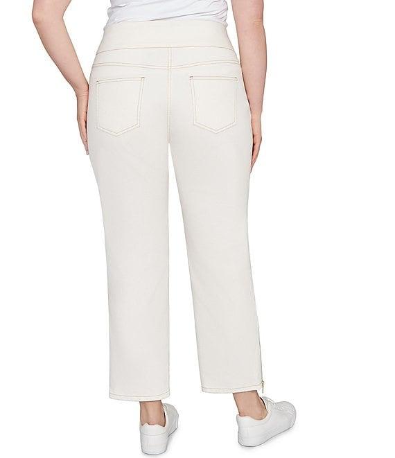 From Ruby Rd. Plus, these pants feature: Soft stretch denim fabrication Wide elastic waistband Faux front pockets; functional back patch pockets Ankle length Functional zippered at hem Un-zip hem for a vintage flared look, or zip them up for a straight fit Pull-on construction Approx. 29.25" inseam Cotton/polyester/spandex Machine wash/tumble dry Imported.