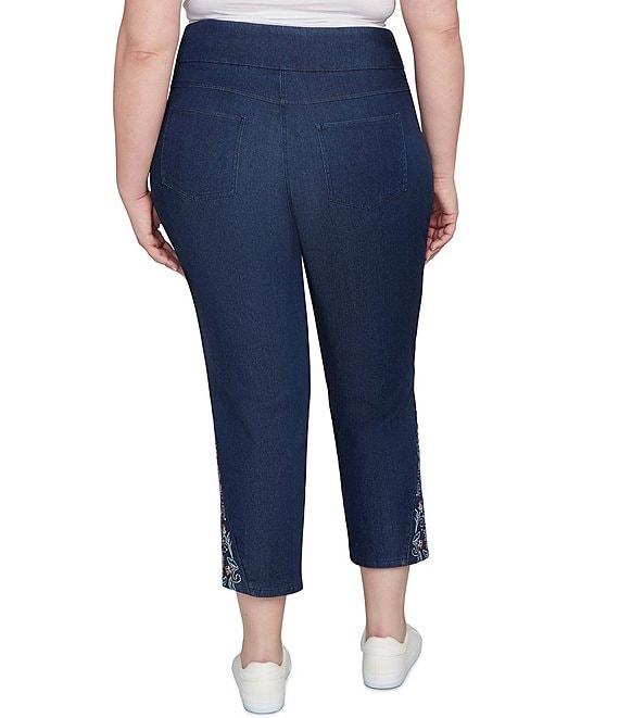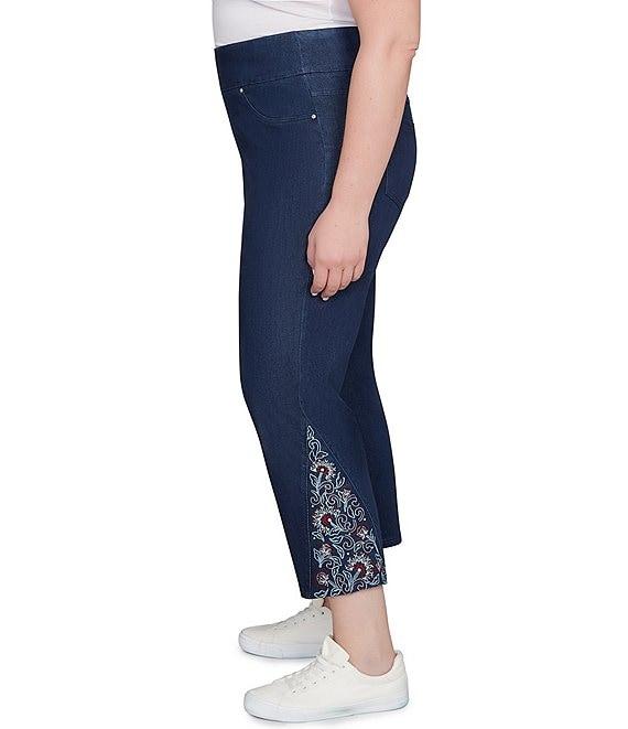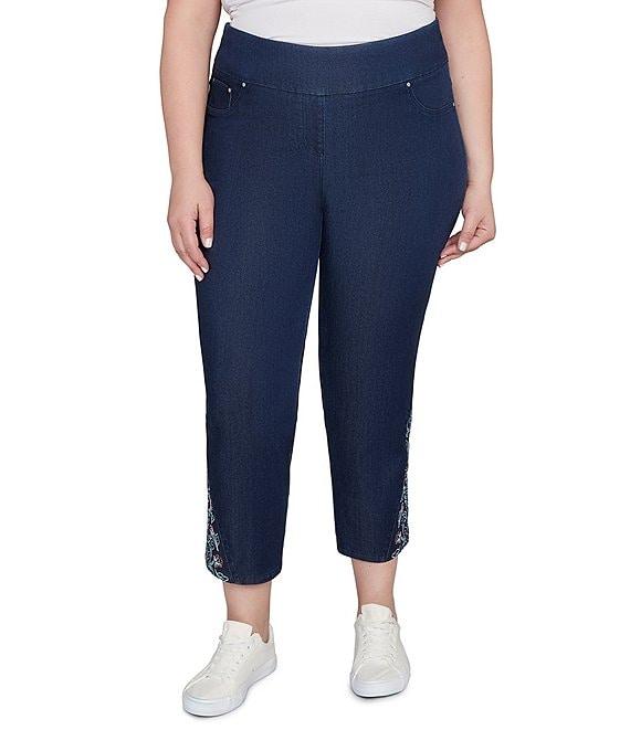 From Ruby Rd. Plus, these pants feature: Wide elasticized waistband Flat front Straight leg Faux-front pockets Functional back pockets Ankle length Embroidered and studs at hem Pull-on construction Approx. 28" inseam Tencel™ lyocell/polyester Machine wash Imported. Experience comfort and style with our super soft stretch denim jeans. Crafted from Tencel(TM) denim with comfortable stretch, they offer a great feel. The wide waistband provides a smooth fit, with faux front pockets for a sleek look and functional back pockets. Detailed embroidery and studs at the ankle add a touch of unique style. These jeans are designed for everyday wear with a little something extra.