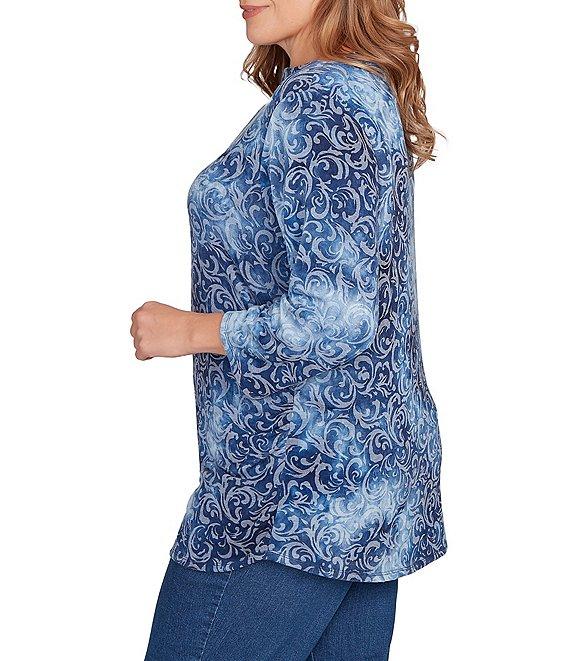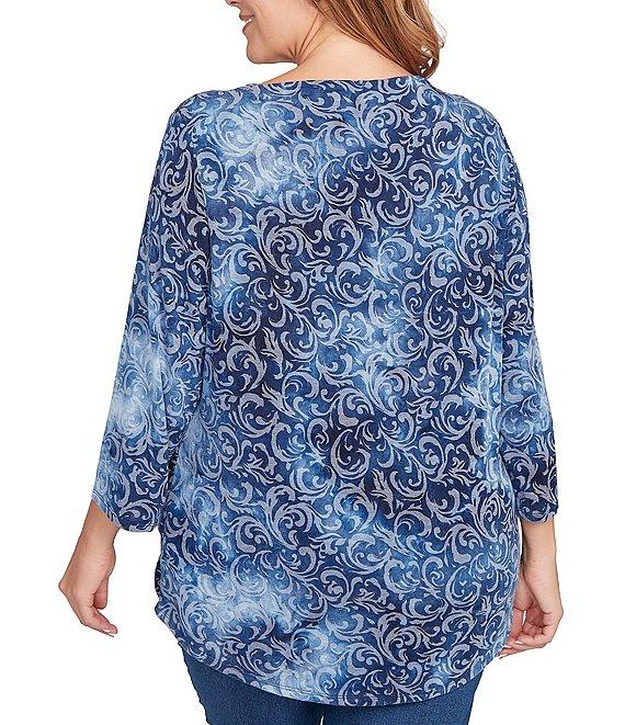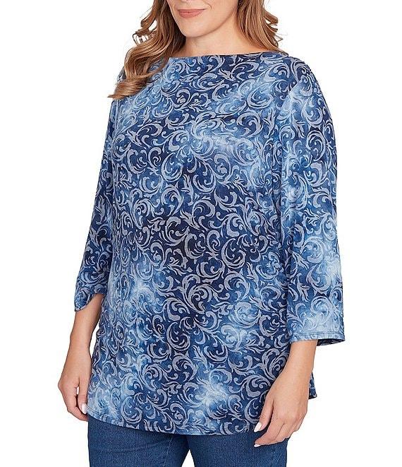 From Ruby Rd. Plus, this top features: Textured knit fabrication Boat neckline 3/4 sleeves Tie-dye scroll floral print Rounded hemline Pullover construction Polyester/rayon/spandex Machine wash/dry flat Imported. This tie dye scroll floral hatchi top is made from a cozy, textured knit fabric where the tie-dye scroll pattern is created by a burnout technique, adding cool subtle sheer areas and dimension. Flattering ruching on the side creates a lovely shape. Its an easy-to-wear top with incredible texture and artistic pattern
