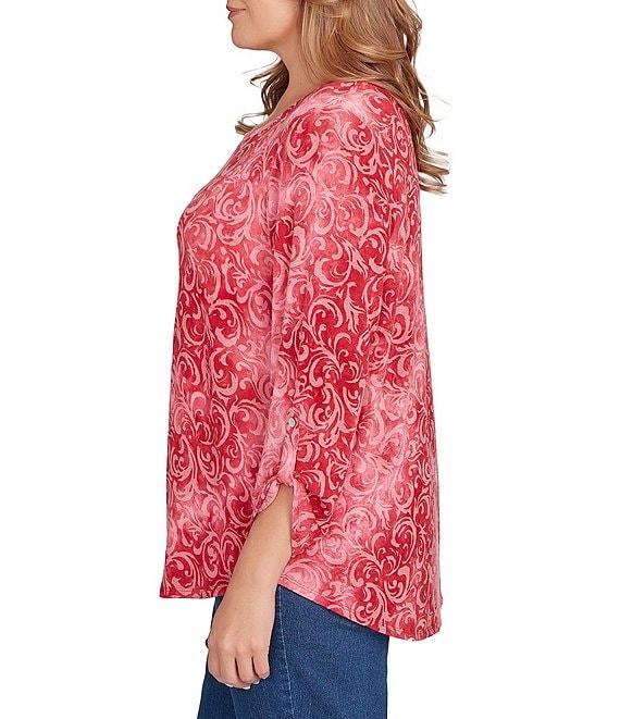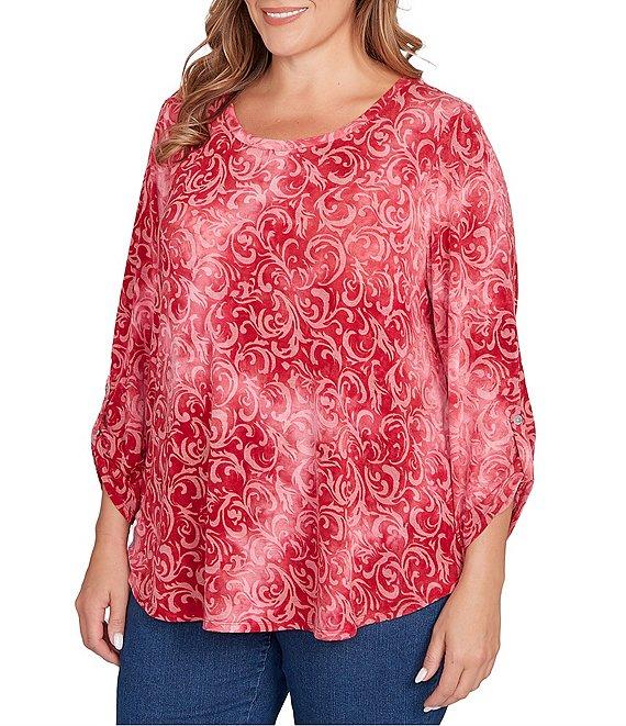 From Ruby Rd. Plus, this top features: Textured knit fabrication Boat neckline 3/4 roll-tab sleeves Tie-dye scroll pattern Pullover construction Polyester/rayon/spandex Machine wash/dry flat Imported. Discover a top with incredible texture and versatile style This top is made from tie dye scroll floral burnout hatchi a cozy, textured knit fabric where the tie-dye scroll pattern is created by a burnout technique, adding subtle sheer areas and dimension. It features versatile 3/4 roll tab sleeves so you can easily adjust the length to suit the weather or your mood. An easy-to-wear top with fascinating fabric and adaptable style