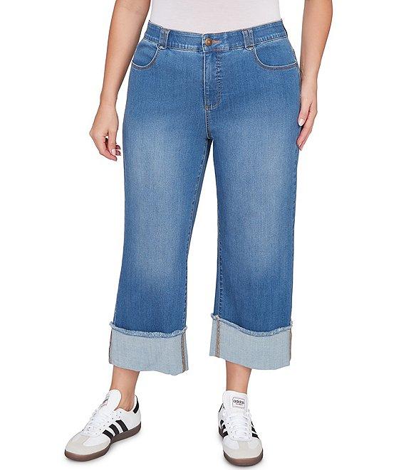 From Ruby Rd. Plus, these jeans feature: Ultra-soft stretch denim fabrication Wide leg Belt loops 5-pocket style Rolled hem can be worn cuffed or uncuffed Button/zip closure Approx. 25.5" inseam rolled; 30" unrolled Cotton/polyester/rayon/spandex Machine wash/tumble dry low Imported. Step up your denim game with these wide-leg convertible cuff jeans, designed for comfort, versatility, and timeless style. Made from ultra-soft stretch denim, they feature a sandblasted wash for a lived-in feel, a classic button fly closure, and five-pocket styling. The convertible rolled cuff lets you customize your look to wear it cropped or full-length, depending on your vibe. A sleek comfort elastic waistband ensures a flattering, flexible fit all day long. These jeans are the perfect blend of relaxed polish and weekend ease.