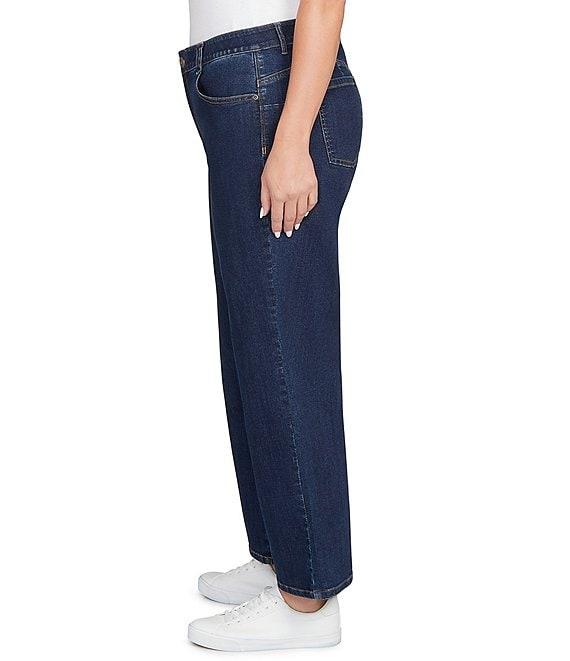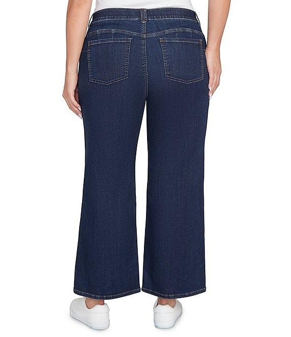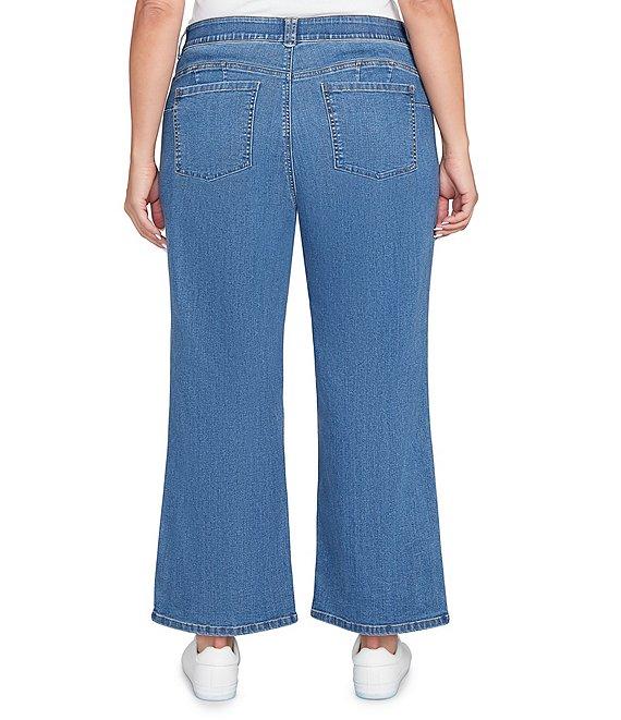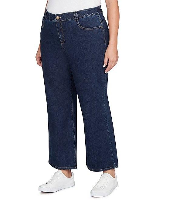 From Ruby Rd. Plus, these denim jeans feature: Denim fabrication Wide leg Belt loops Functional front and back patch pockets Relaxed fit Button/zip closure Approx. 30" inseam Cotton/polyester/rayon/spandex Machine wash/tumble dry Imported. A widertake on a classic These stovepipe jeans do vintage right. A chic button fly and classic 5-pocket styling give these jeans timeless attitude-with a little extra flair.