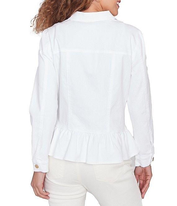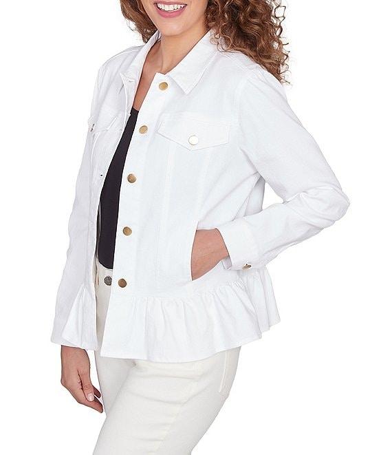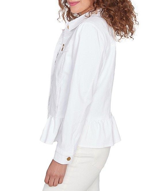 From Ruby Rd., this jacket features: Denim stretch fabrication Point collar Long sleeves with button closure Front flap pockets with button closure Back yoke Ruffle hemline Button front closure Approx. 23" length Cotton/polyester/spandex Machine wash/tumble dry Imported. This stylish jacket features a classic denim design with a ruffled hem for a playful and feminine touch. The stretch denim fabric ensures a comfortable fit, while the button-up closure adds a touch of sophistication. The jacket also features convenient pockets for added functionality.