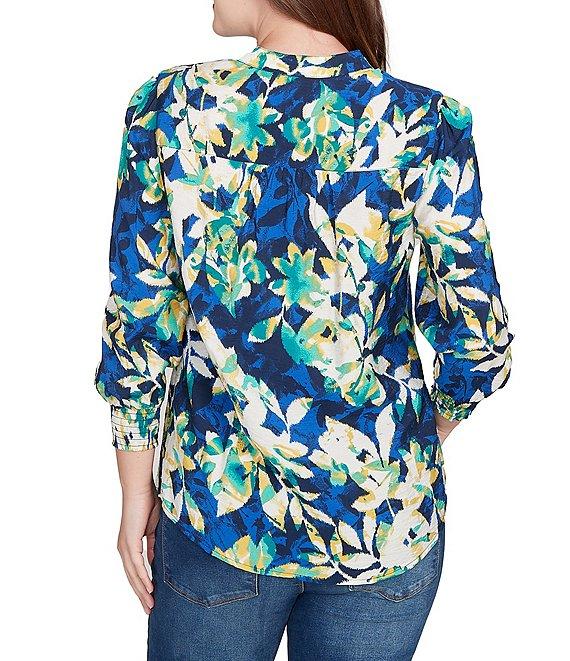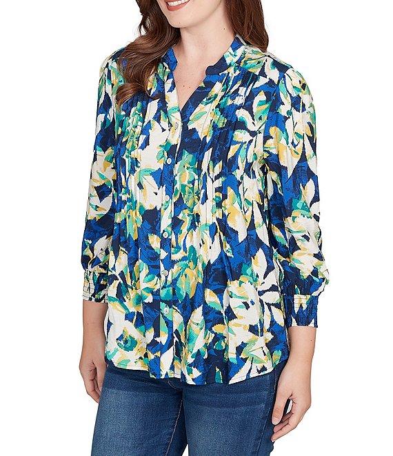 From Ruby Rd., this blouse features: Lightweight silky voile fabrication Banded v-neckline 3/4 sleeves with elastic-cuffs Floral print Pleated detail Curved hem Button-front closure Rayon/nylon Machine wash Imported. Breezy meets beautiful. This lightweight floral blouse brings easy elegance to your everyday with silky voile fabric, soft pleating, and elastic-cuffed sleeves for a touch of structure. The banded collar keeps it polished, whether you wear it solo or layered.