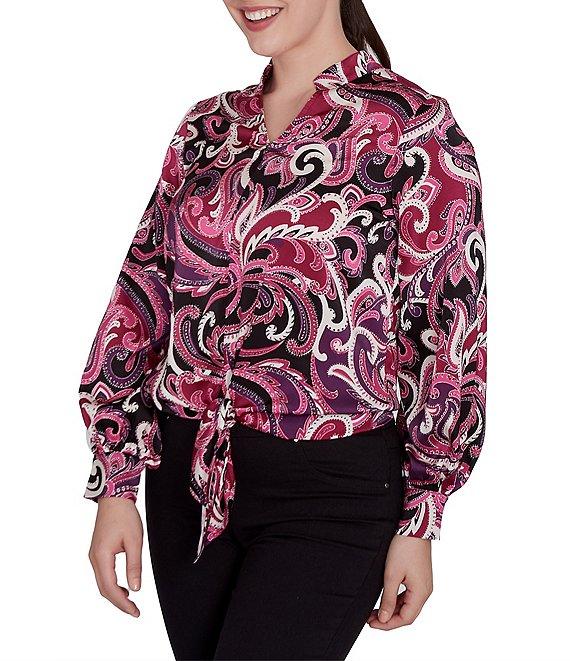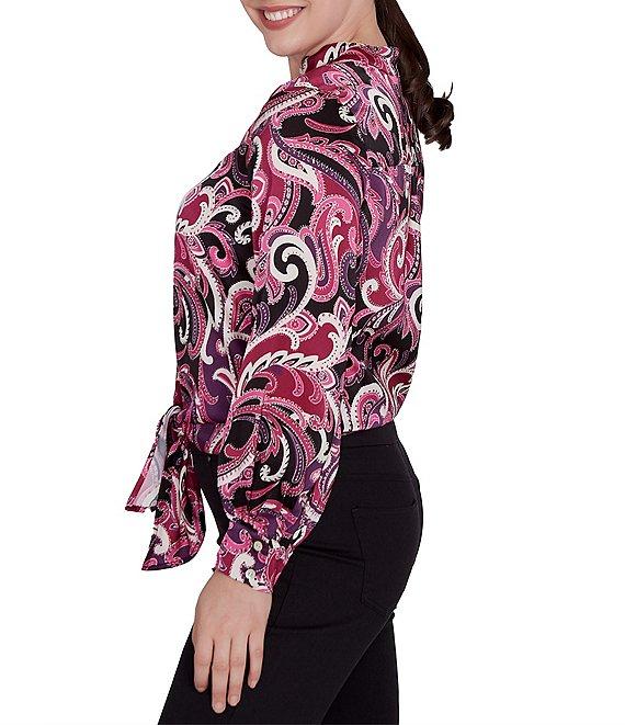 From Ruby Rd., this top features: Woven fabrication Band collar with a split v-neckline Long bishop puff sleeves with buttoned cuffs Paisley print Loose fit Tie-front hemline Pullover construction Polyester Machine wash cold/line dry Imported.
