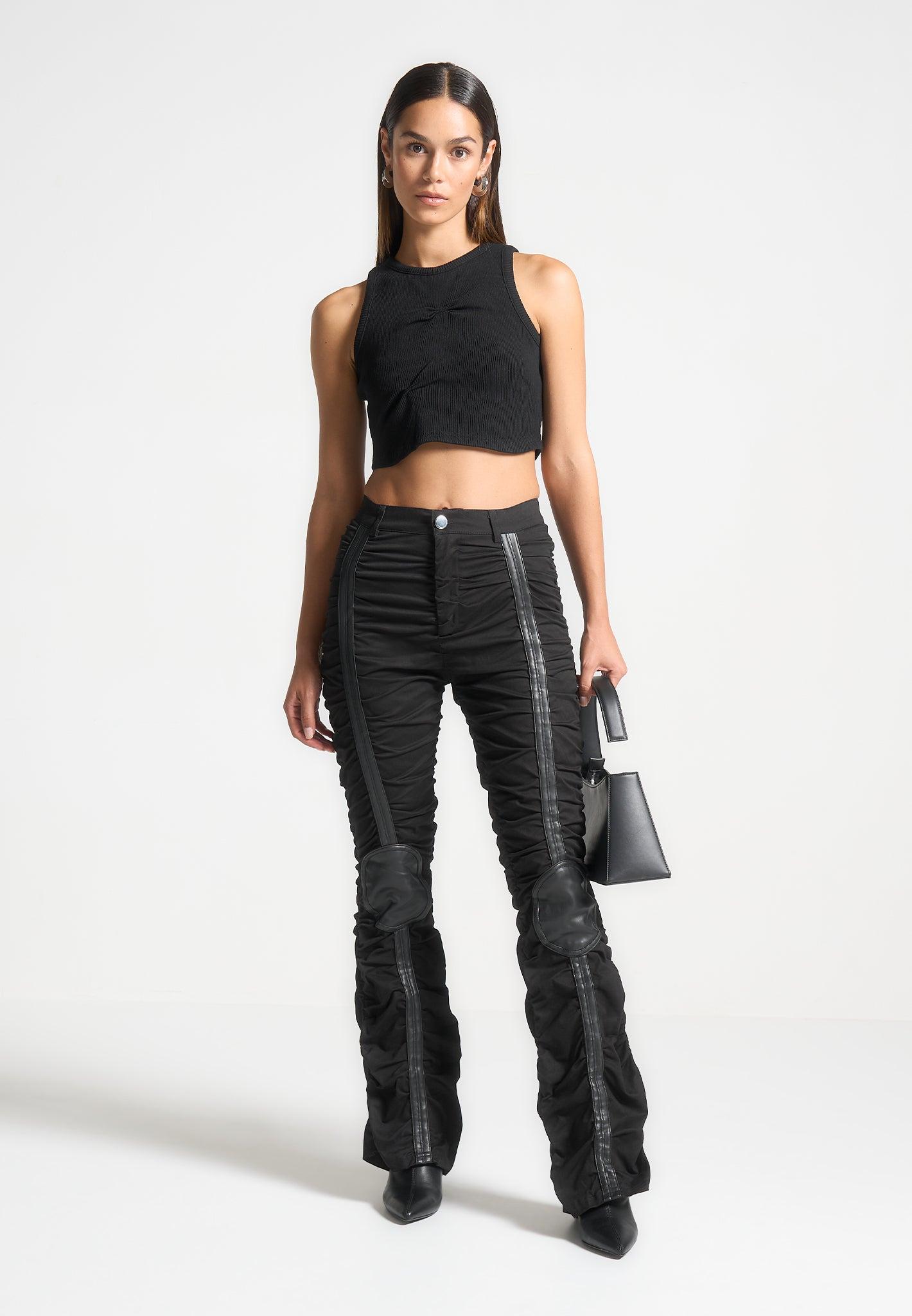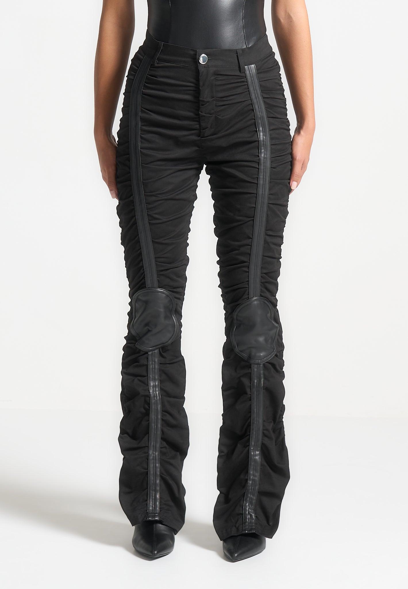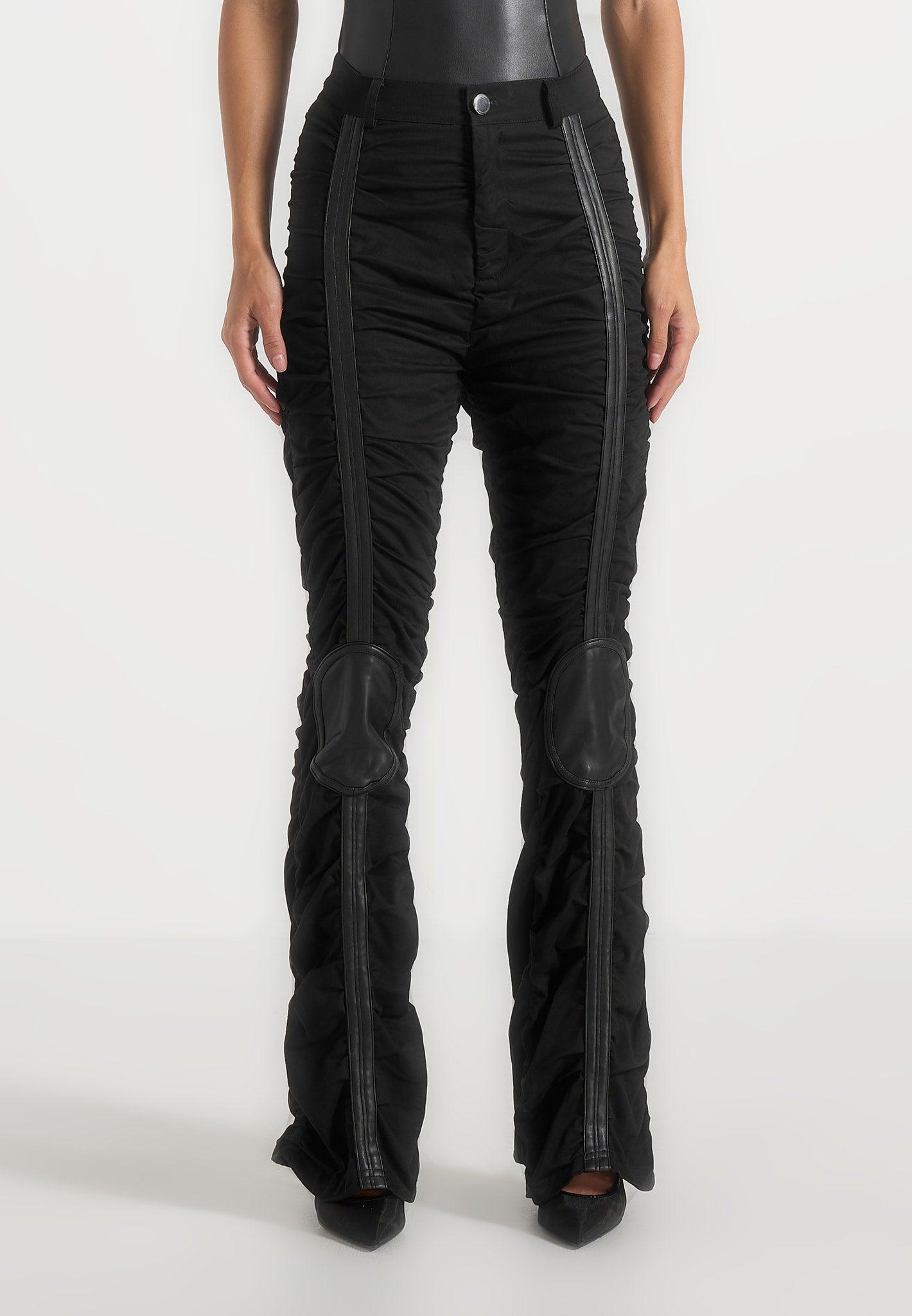 With all over ruching, these trousers are perfect for day to night occasions. The vegan leather knee patches add a more casual touch to broaden the styling opportunities. Fit and Flare Trousers Silhouette All Over Ruching Vegan Leather Detailing Internal Elasticated Waistband Vegan Leather Manière De Voir Branded Patch 97% Cotton, 3% Elastane / 55% Polyester, 45% PUAlways check the care label for wash instructions.
