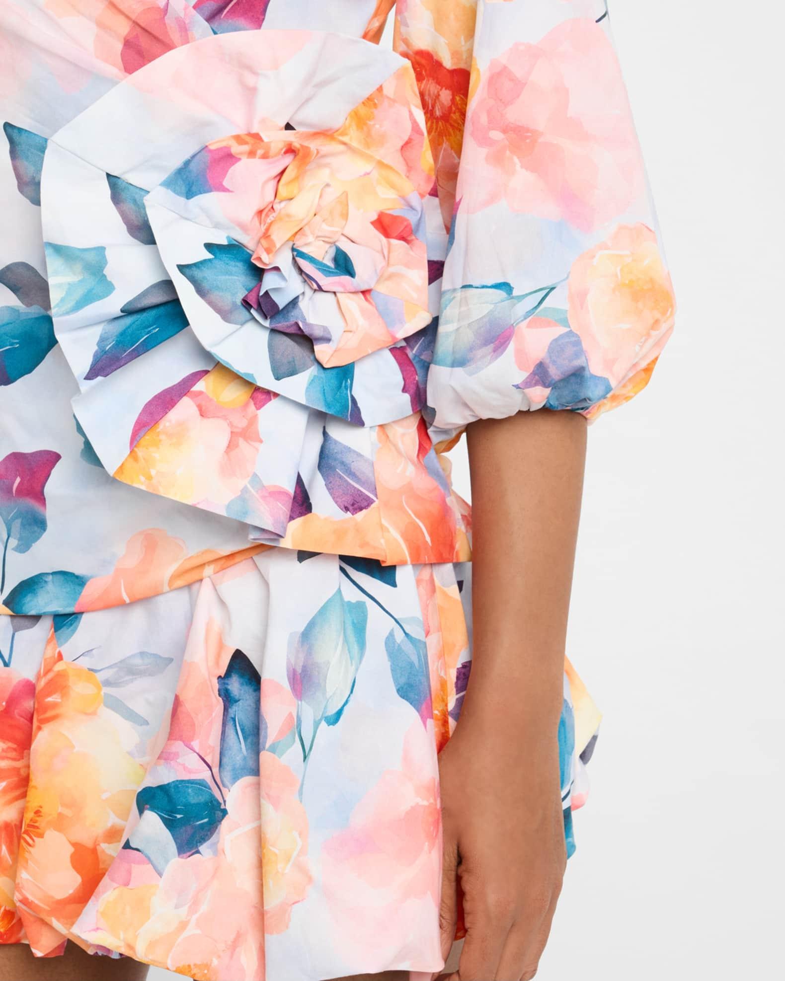 Chiara Boni La Petite Robe ruched mini dress features a watercolor floral print and side ruffle flower Surplice neckline 3/4 blouson sleeves Elasticized cuffs Flounce bubble hem Hem falls above the knee A-line silhouette Cotton/elastane Made in Italy Please note: To dress, step into garment rather than pulling it over the head.