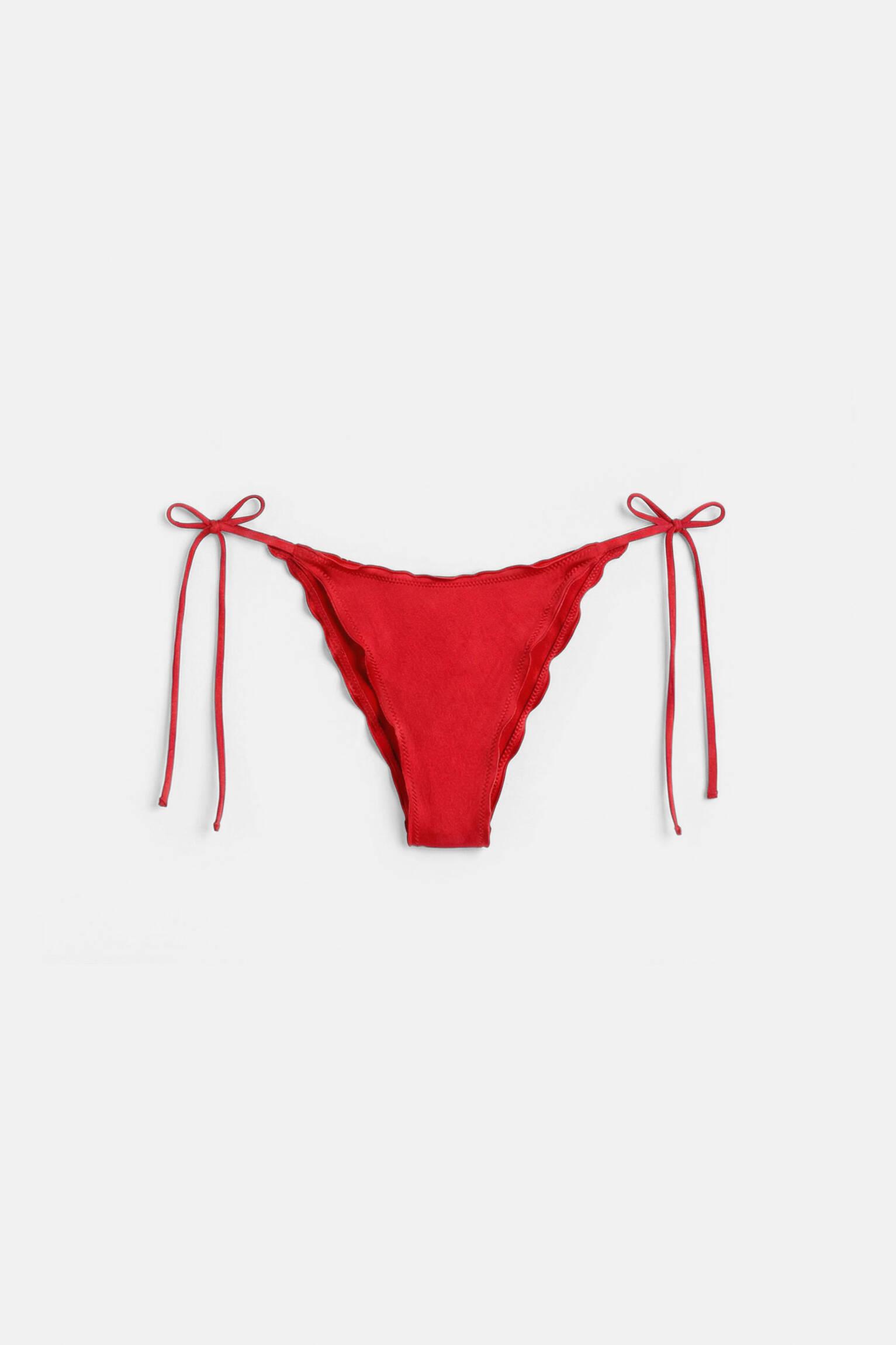 Brazilian bikini bottoms with ruffle trims and knot fastening at the sides. Made of stretchy polyamide fabric.