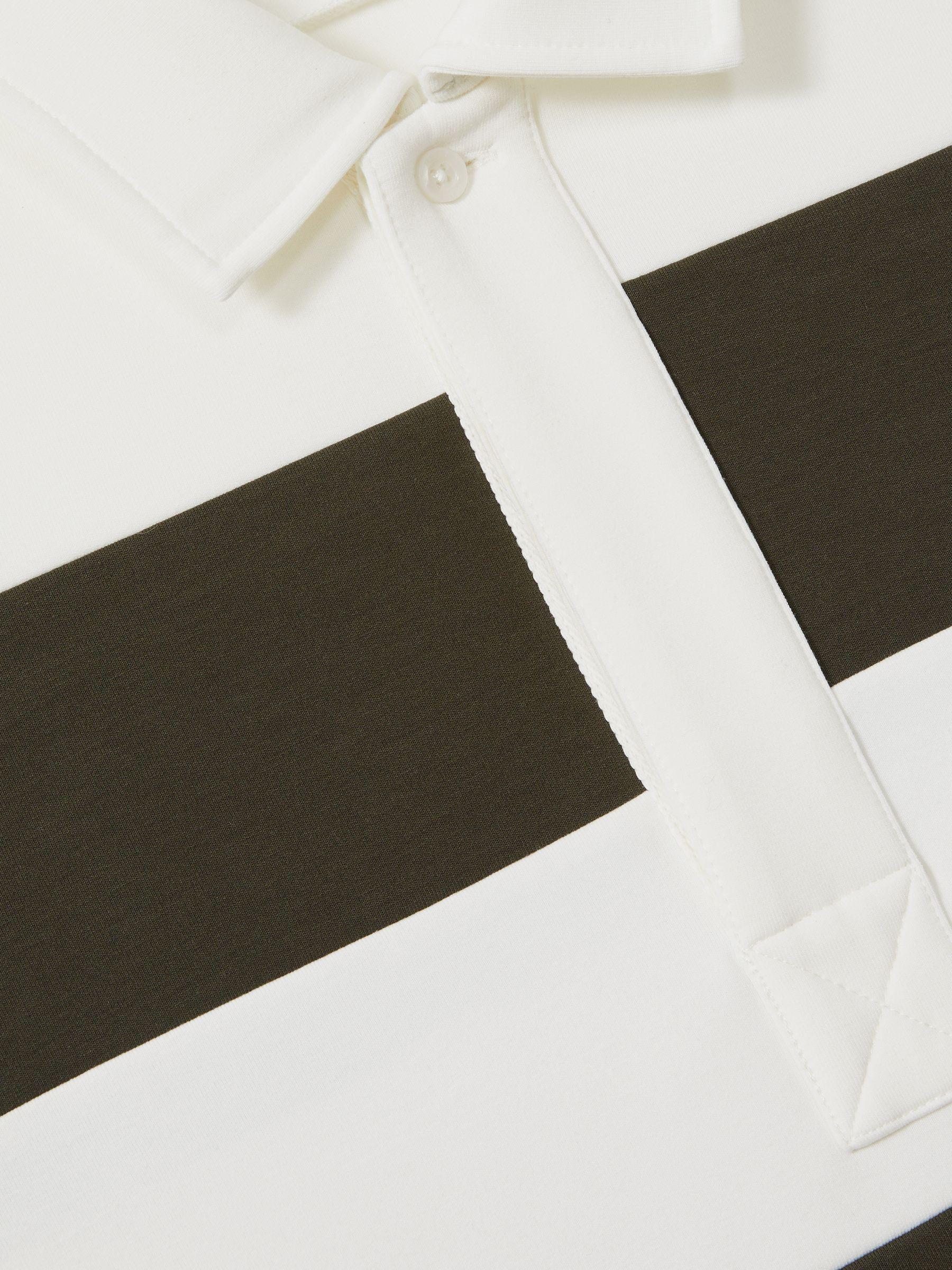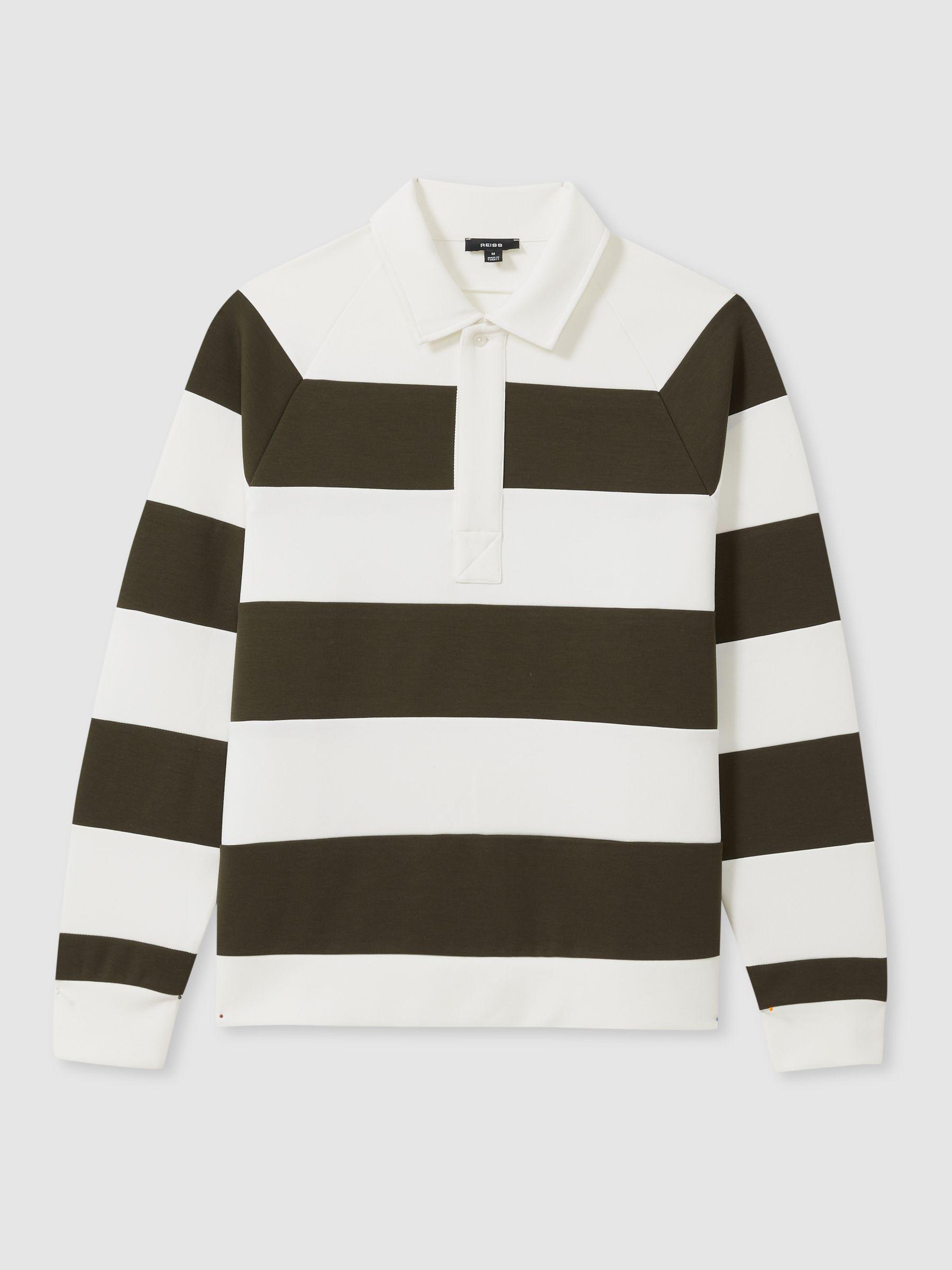 A sporty style for casual wardrobes, the Trafalgar T-shirt is elevated by wide ruby stripes. A polo collar and concealed button placket complete the neckline. Rugby stripes. Polo neckline with concealed button placket. Long raglan sleeves. Measurements of model: Height 6ft 2.5 / 189cm . The model is wearing a size M.