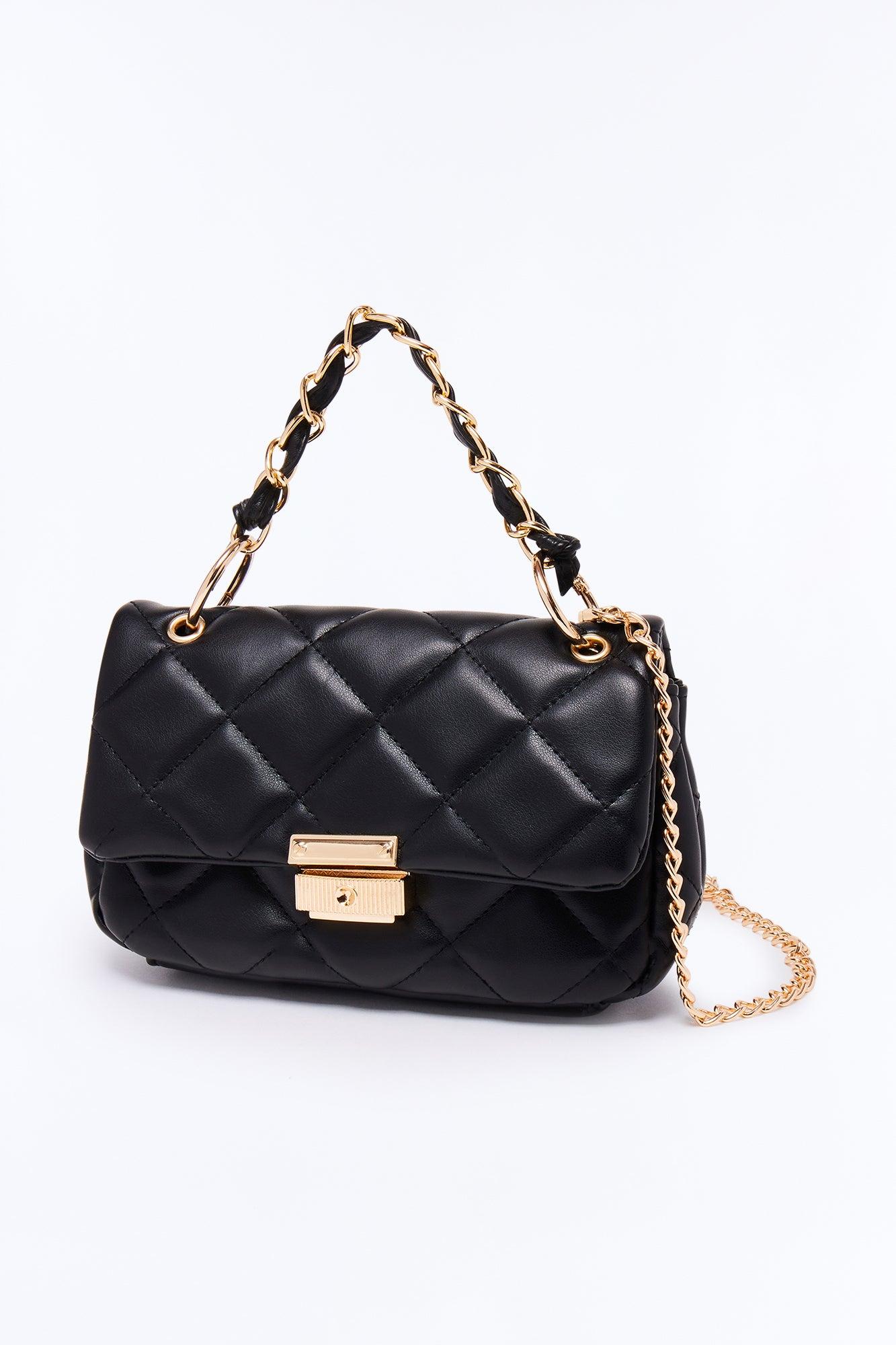 Available In Black. Satchel Bag Foldover Closure Hardware Closure Detail Faux Leather Material Quilted Pattern Chain Handle Detail Dimensions: 8.25" x 2.75" x 4.7" Imported