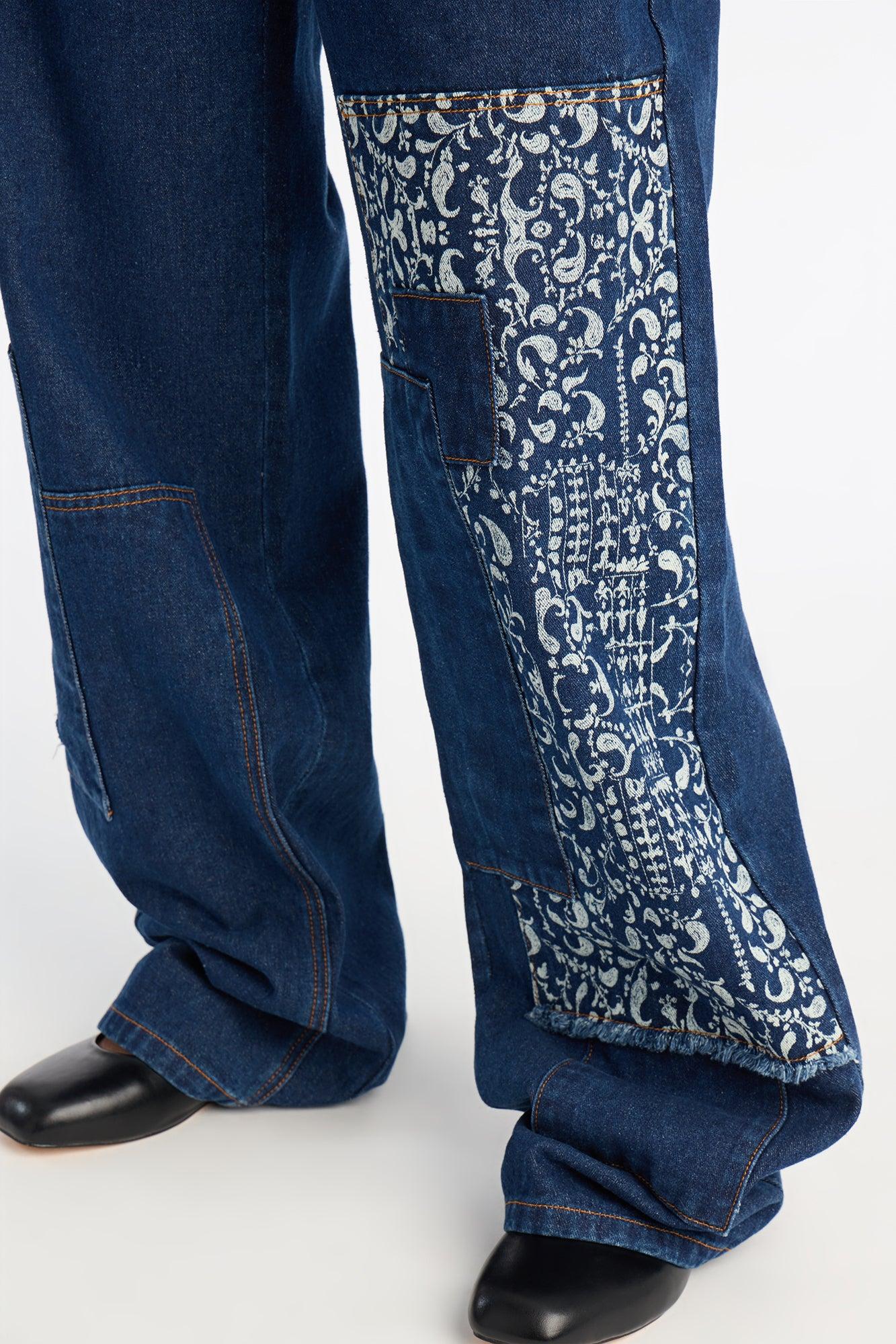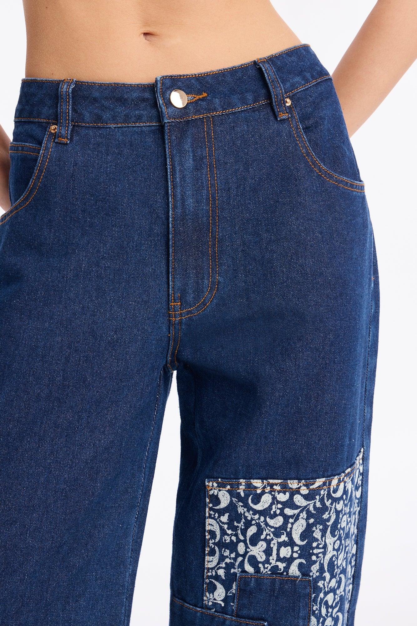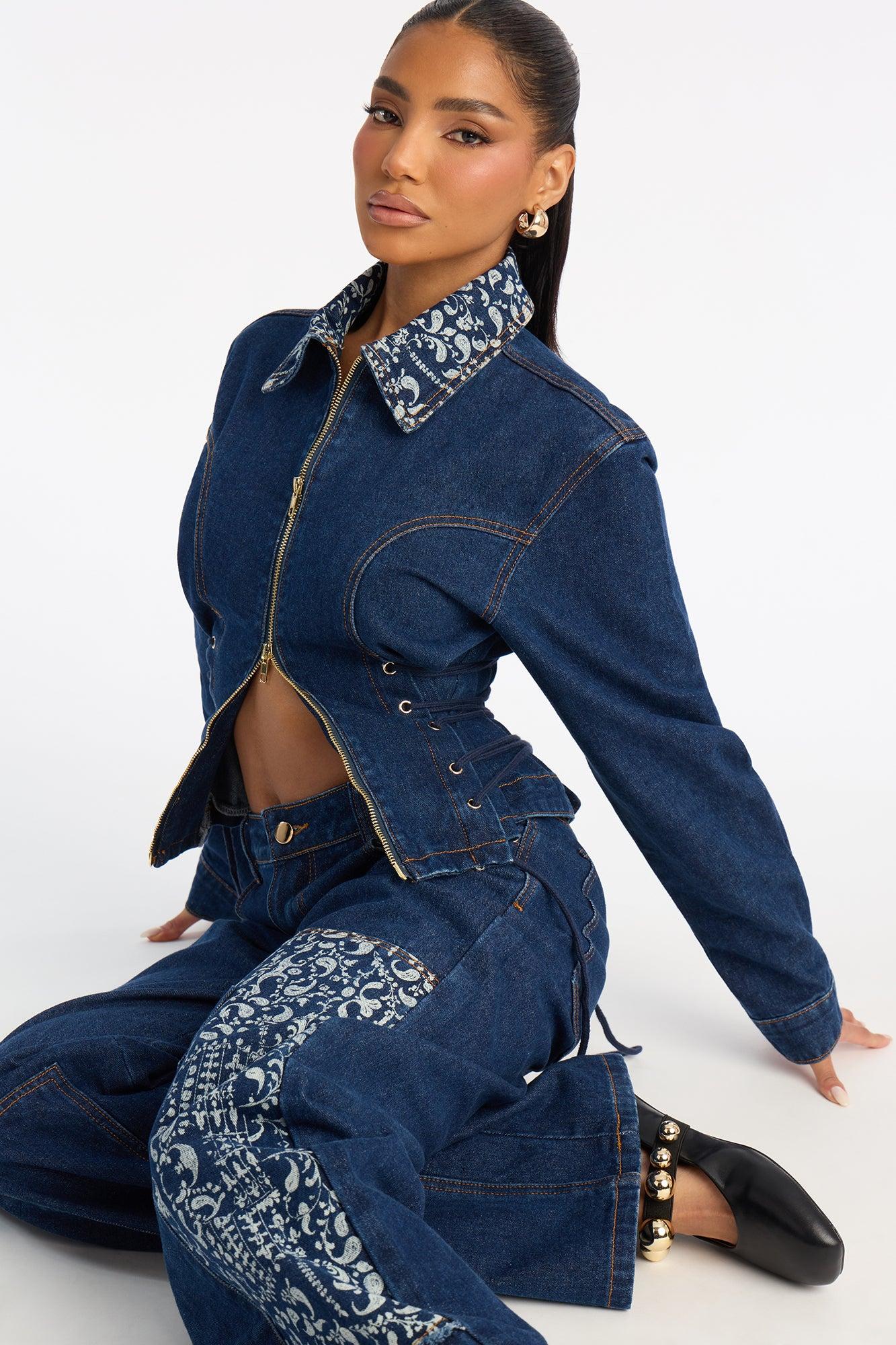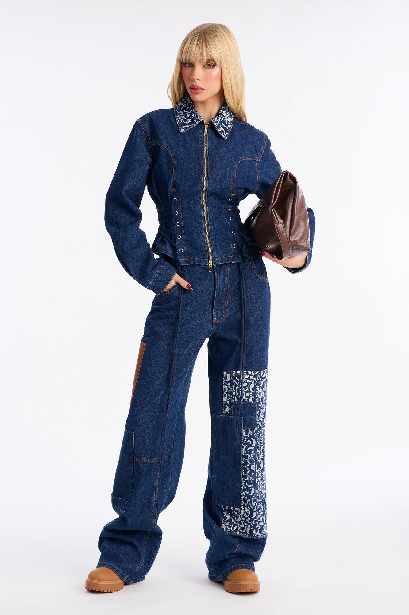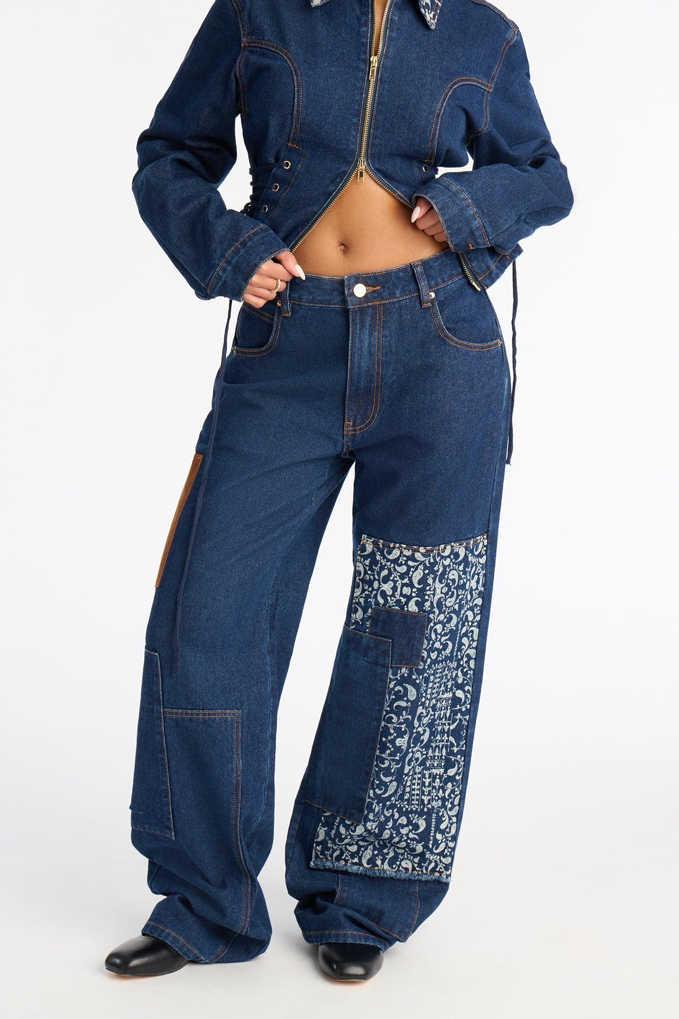 Available In Rinse Blue Wash. Pair With Runaway Rodeo Lace Up Denim Jacket Wide Leg Jean 5 Pocket Detail Front Zipper And Button Closure Paisley Print Patch Brown Corduroy Patch Ripped 10.75" Rise 33.5" Inseam Non-Stretch Disclaimer: Due To The Specialized Wash, Each Garment Is Unique. Self: 90% Cotton 10% Polyester Imported California Proposition 65WARNING: Cancer and Reproductive Harm - www.P65Warnings.ca.gov.