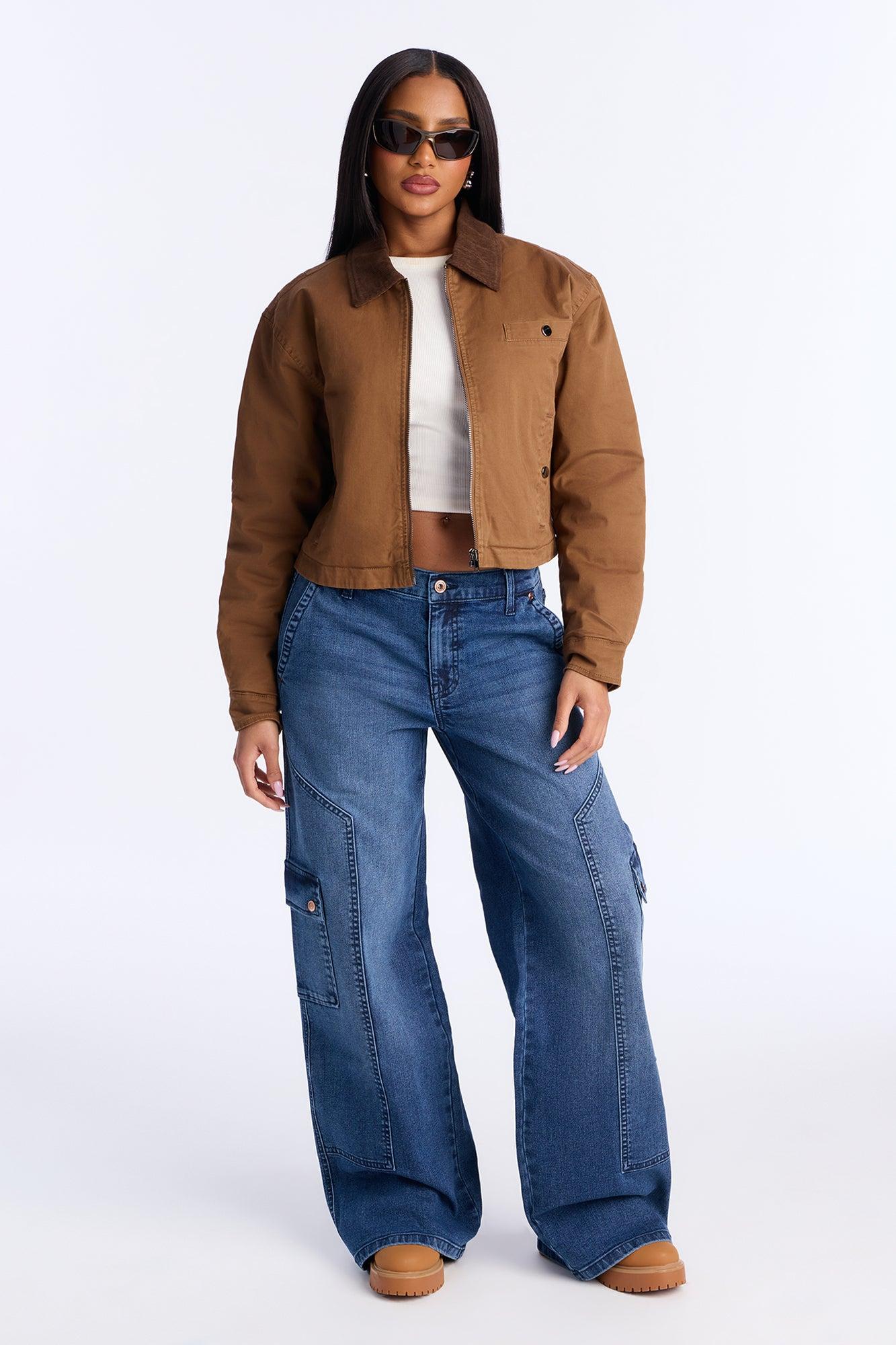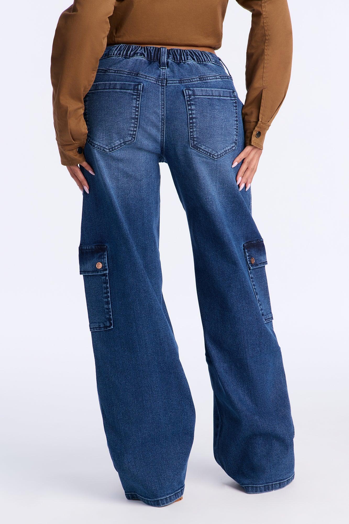 Available In Dark Wash. Wide Leg Jean Cargo Pockets Seaming 10" Rise 31" Inseam Medium Stretch Disclaimer: Due To The Specialized Distressing & Wash Process, Each Garment Is Unique.Disclaimer: Due To The Specialized Wash Process, Each Garment Is Unique. Self : 72% Cotton 24% Polyester 3% Rayon 1% Spandex Imported California Proposition 65WARNING: Cancer and Reproductive Harm - www.P65Warnings.ca.gov.