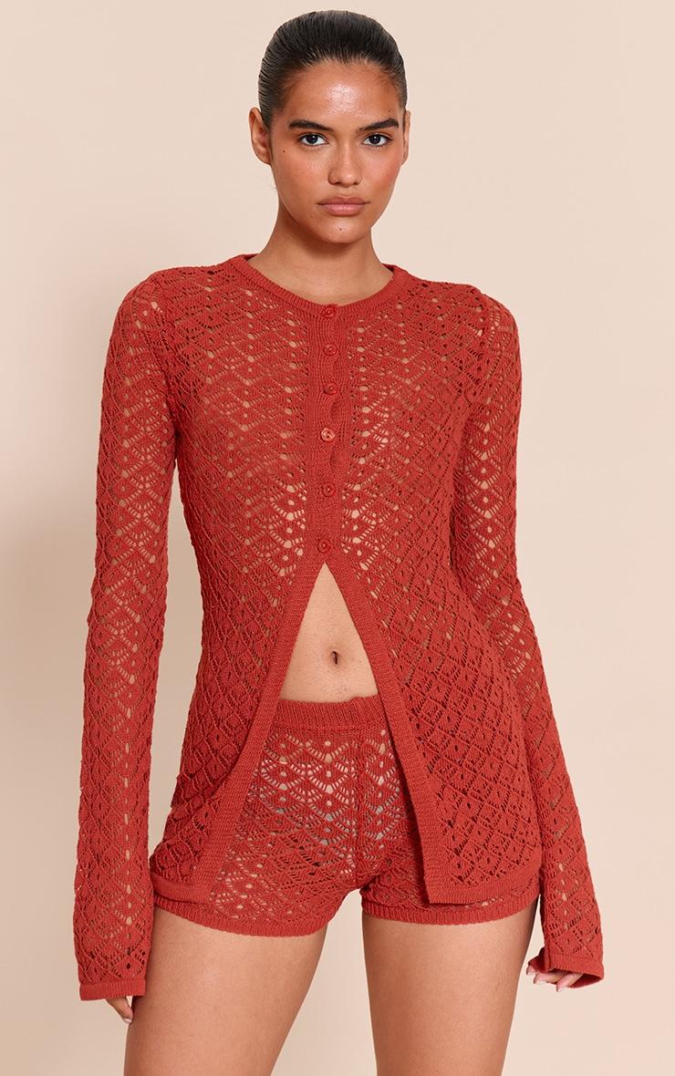 Feel confident in these rust crochet knit mini shorts. Brought to you in rust toned crochet knit material, these shorts have a stretch waist and a mini length fit. For a put-together look, add the matching cardigan, strappy kitten heels and a slouchy clutch. Length may vary due to crochet knitLength approx 33cm/13inch (Based on sample size S)Model wears size SModel Height - 5ft 7inchp]:!mb-4inch>Category: KnitwearProduct type: ShortsColor: RustMaterial: Crochet KnitOccasion: Day