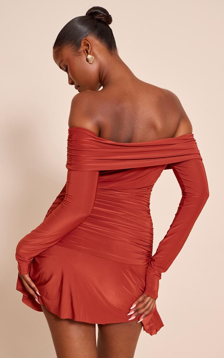 Channel a confident aura. The rust double layer slinky long sleeve bardot mini dress perfectly embodies it, featuring an elegant off-shoulder bardot neckline and long, ruched sleeves that lead to a cinched body, crafting a defined silhouette before flowing into a mini length. For your next evening out, style this rust essential with sleek barely-there heels and a structured clutch. Finish the look with subtle gold jewelry for an artful touch. It’s the ultimate piece for an unforgettable evening presence.Length approx 58.5cm/23inch (Based on sample size US 4)Model wears size UK 8/ EU 36/ AUS 8/ US 4Model Height - 5ft 9inchp]:!mb-4inch>Brand: PrettyLittleThingCategory: DressesProduct type: Shift DressColor: RustMaterial: Slinky JerseyNeckline: BardotSleeves: LongOccasion: Evening