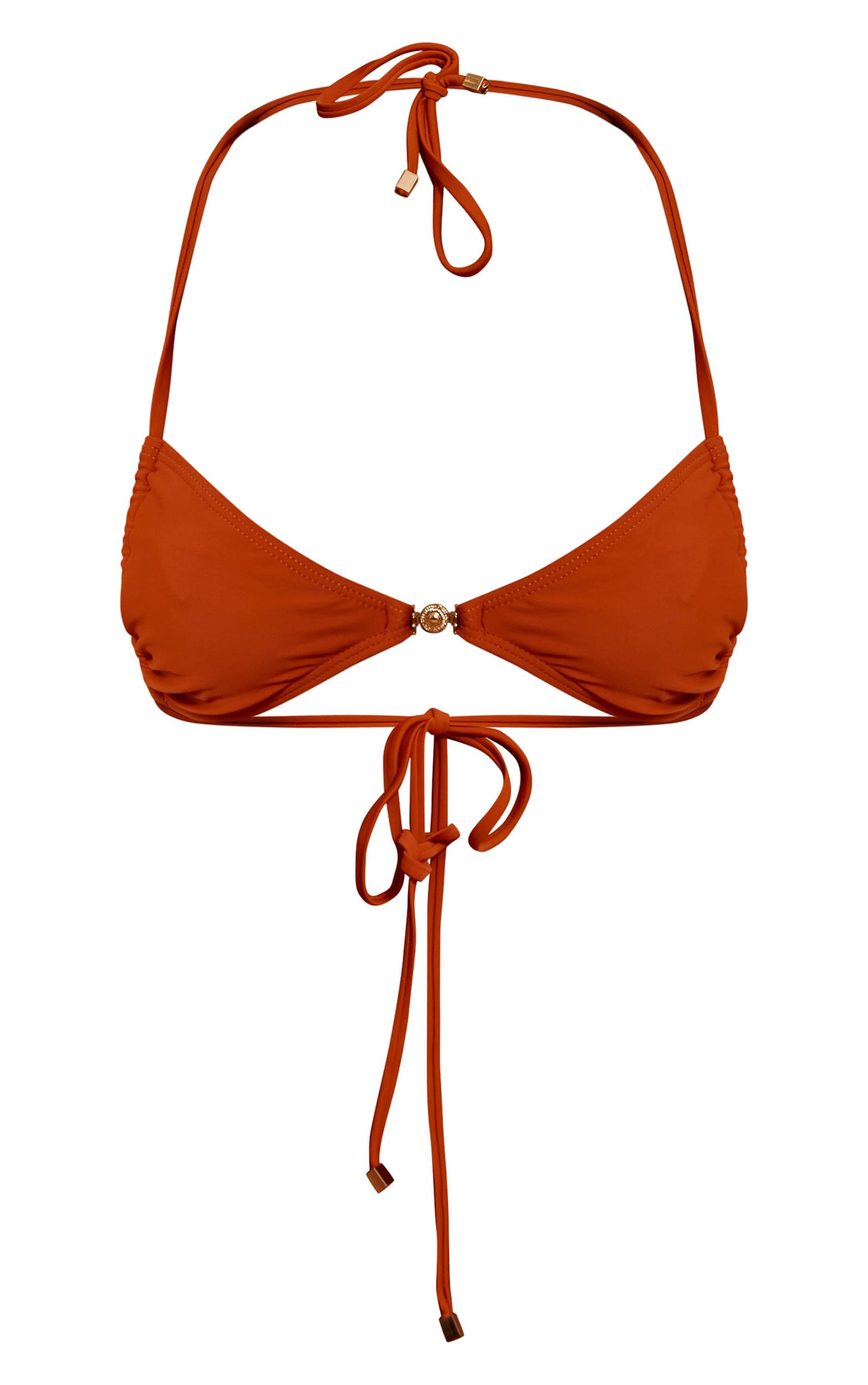 Feel your best in this rust gold trim detail tie back bikini top. Made from rust toned material, this bikini top has gold trim detailing and tie back fastenings. For an elevated seasonal look, add the matching bottoms, chunky sandals and a sleek sarong.Length approx 29cm/11.5inch (Based on sample size US 4)Model wears size UK 8/ EU 36/ AUS 8/ US 4Model Height - 5ft 6inchp]:!mb-4inch>Brand: PrettyLittleThingCategory: SwimwearProduct type: Triangle Bikini TopColor: RustMaterial: SwimOccasion: Day
