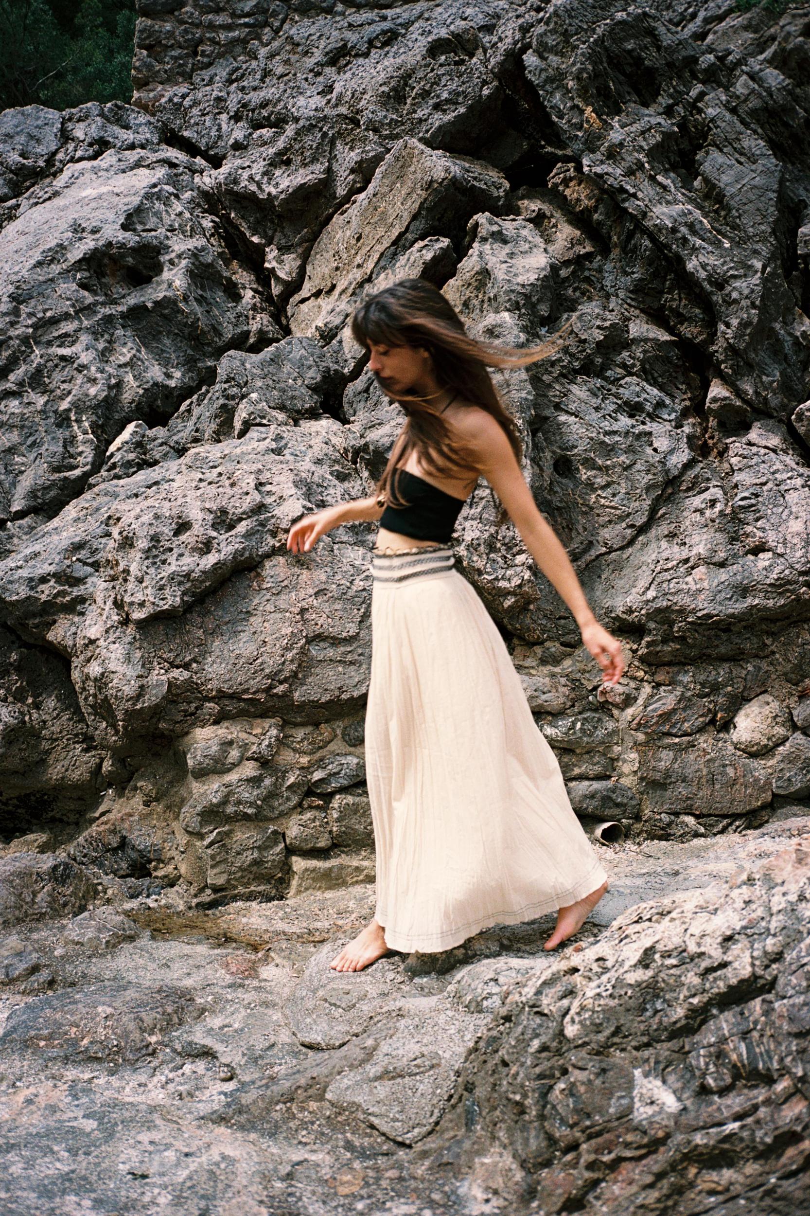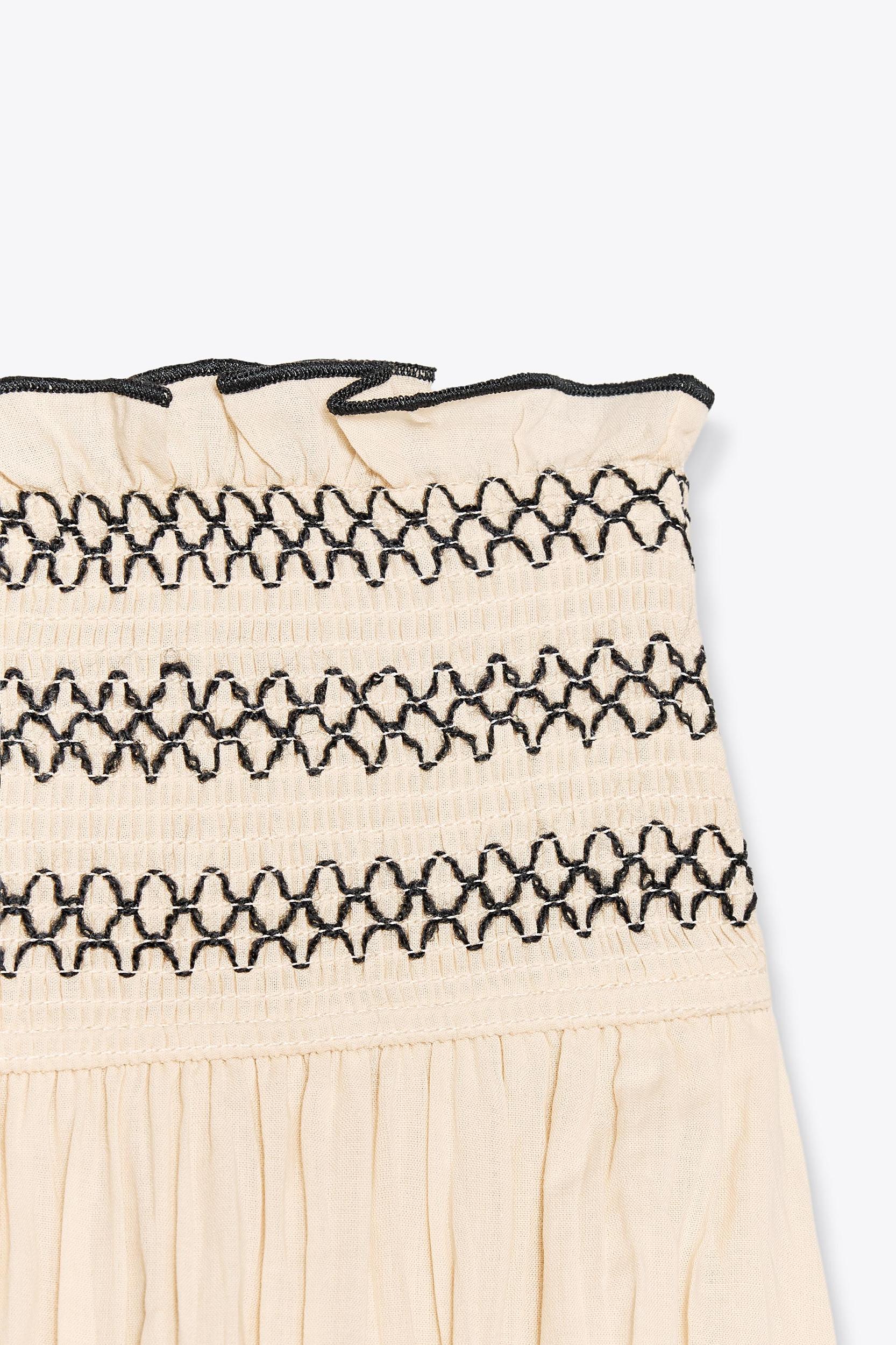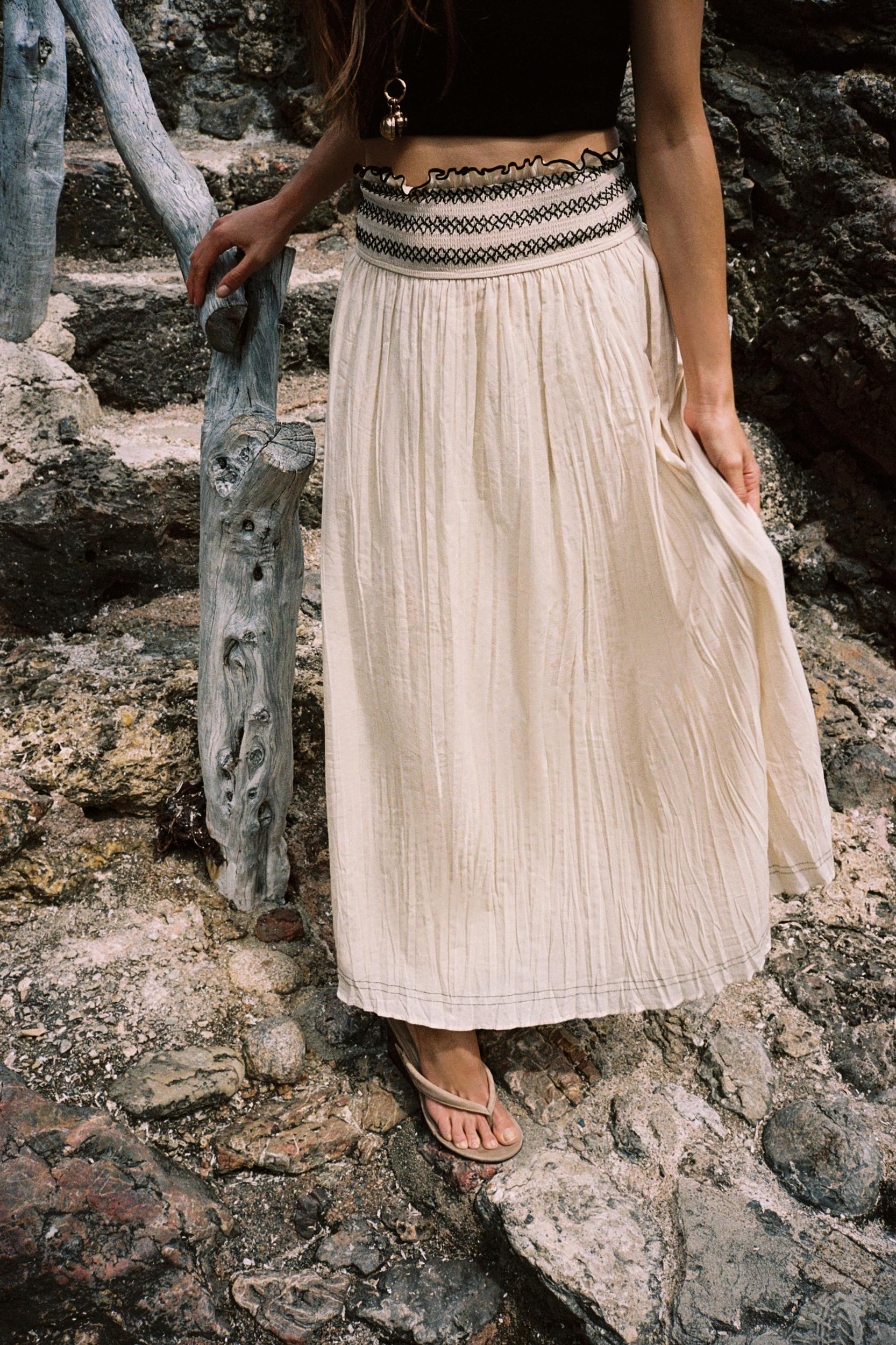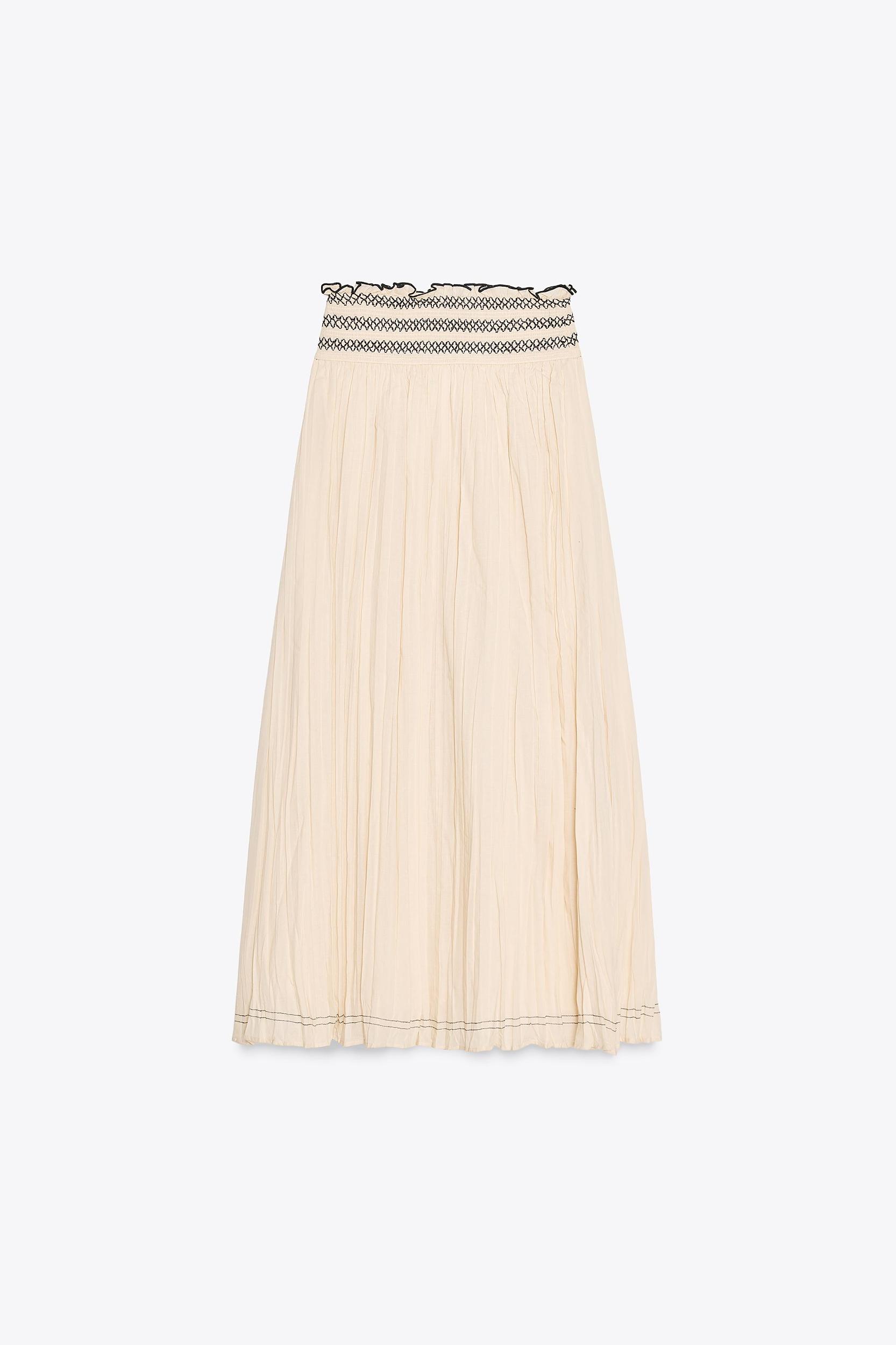High-waisted skirt with wide elastic smocked detail. Crinkle effect fabric detail and contrasting topstitching. Interior lining.