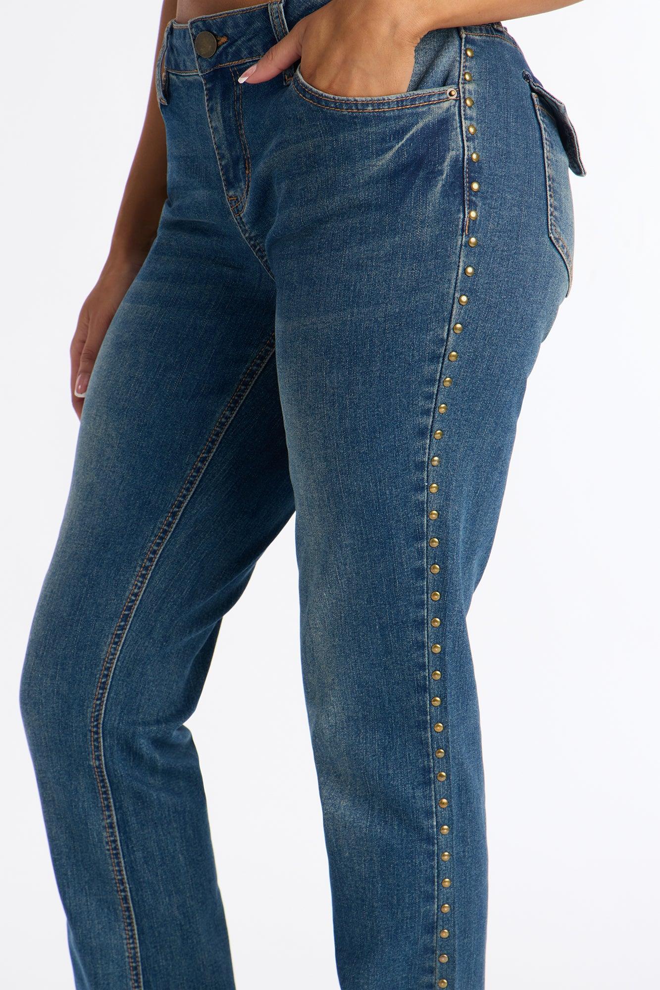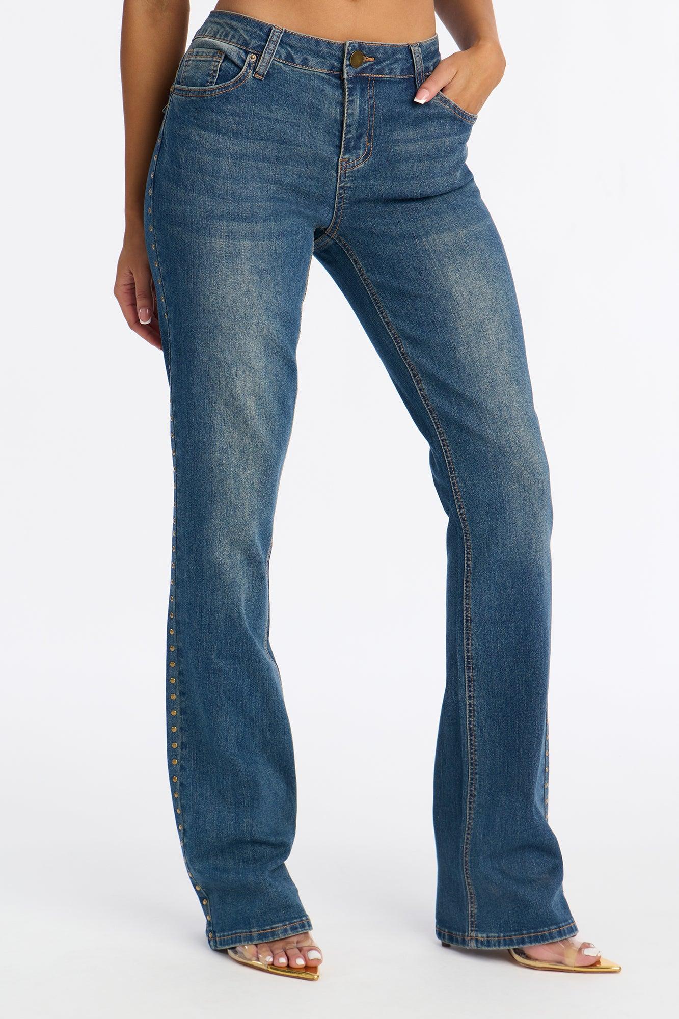 Available In Vintage Wash. Pair With Saddle Down Studded Denim Vest Bootcut Jean 5 Pocket Back Flap Pockets Studded Tinted 8" Low Rise 34" Inseam Medium Stretch Disclaimer: Due To The Specialized Wash Process, Each Garment Is Unique. 67% Cotton 31% Polyester 2% Spandex Imported