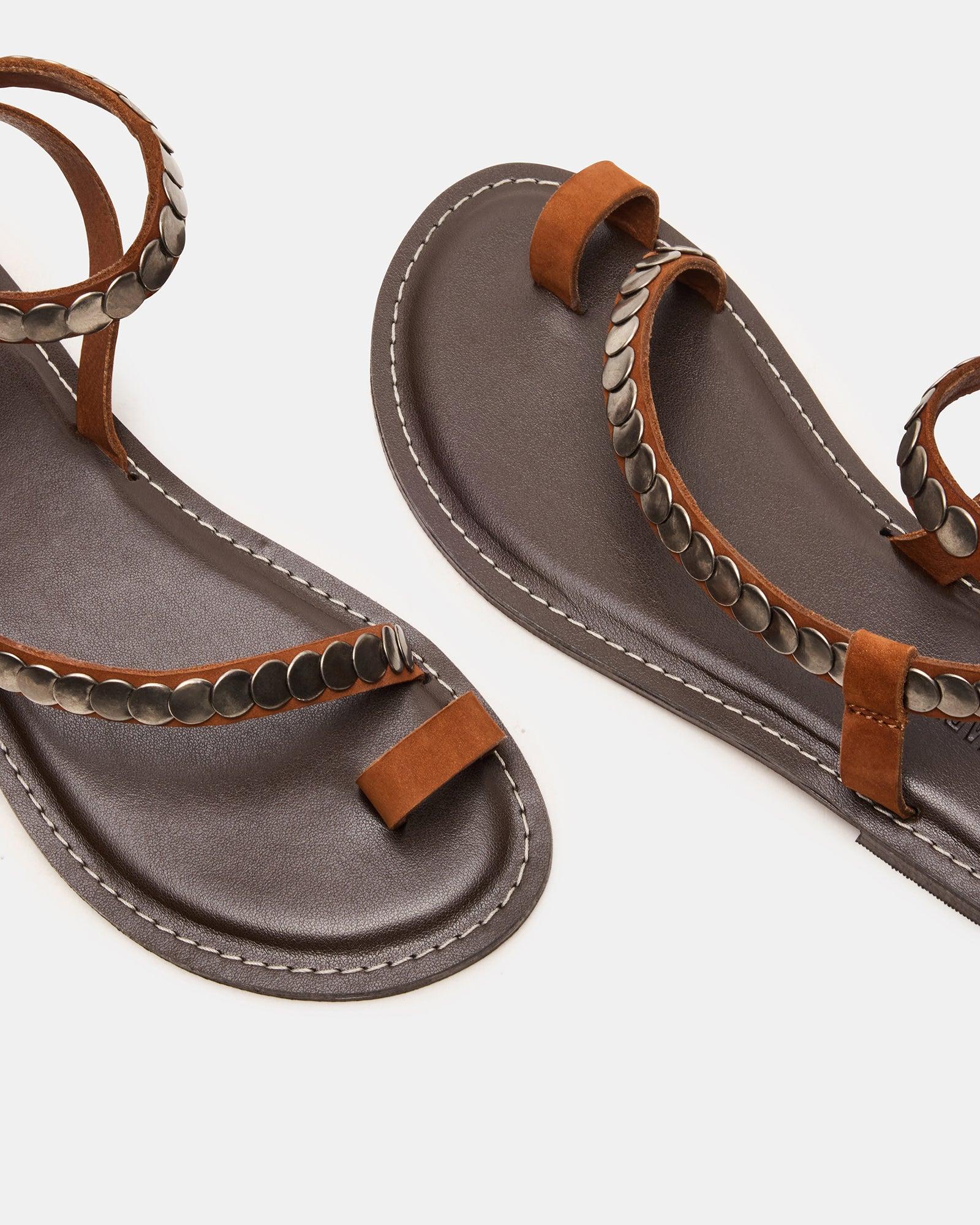 The SAGA - a strappy flat sandal featuring a rounded toe and secure ankle strap. With its sleek design, this sandal provides both style and comfort for any occasion. The perfect choice for those seeking a secure fit with added elegance. .5 inch heel height Leather upper material with hardware Synthetic lining Synthetic sock Synthetic sole Imported