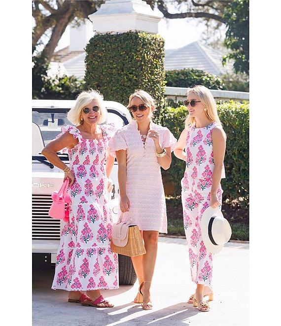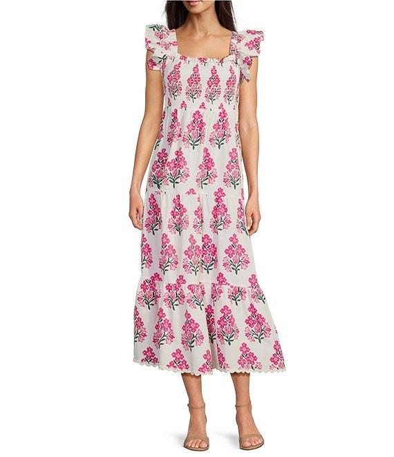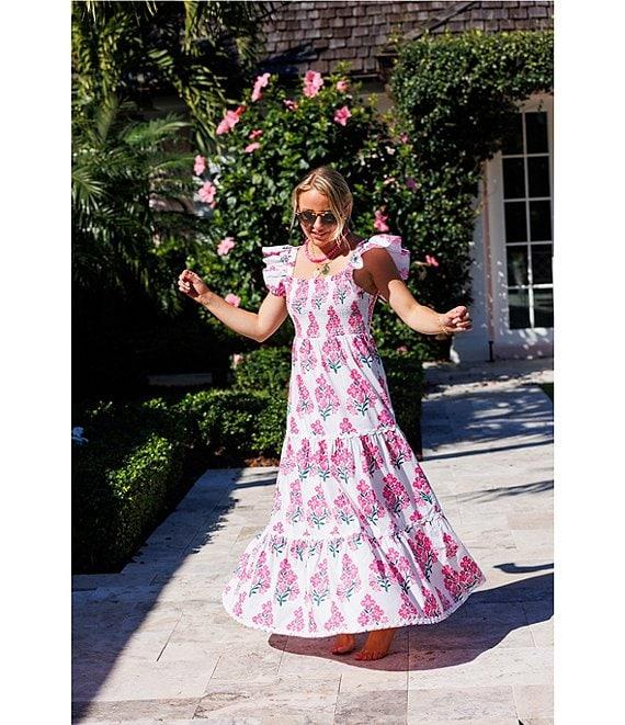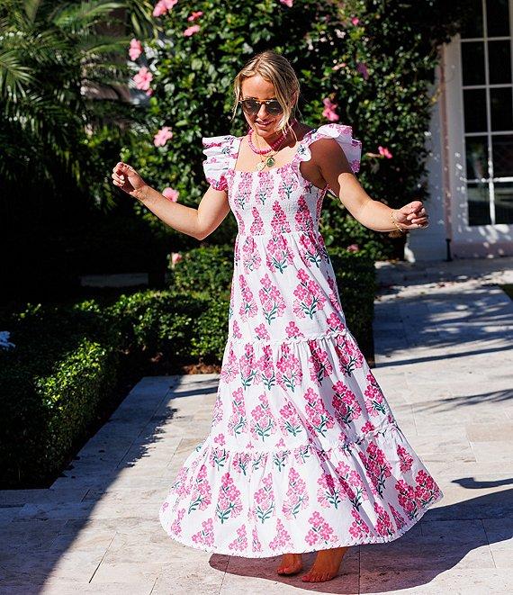 From SAIL to SABLE x Amy Littleson McNitt, this dress features: Woven fabrication Hibiscus block print Smocked bodice Square neckline Flutter sleeves Ric rac trim detail Tiered Straight hem Pullover construction Approx. 47" length Cotton Machine wash Imported.