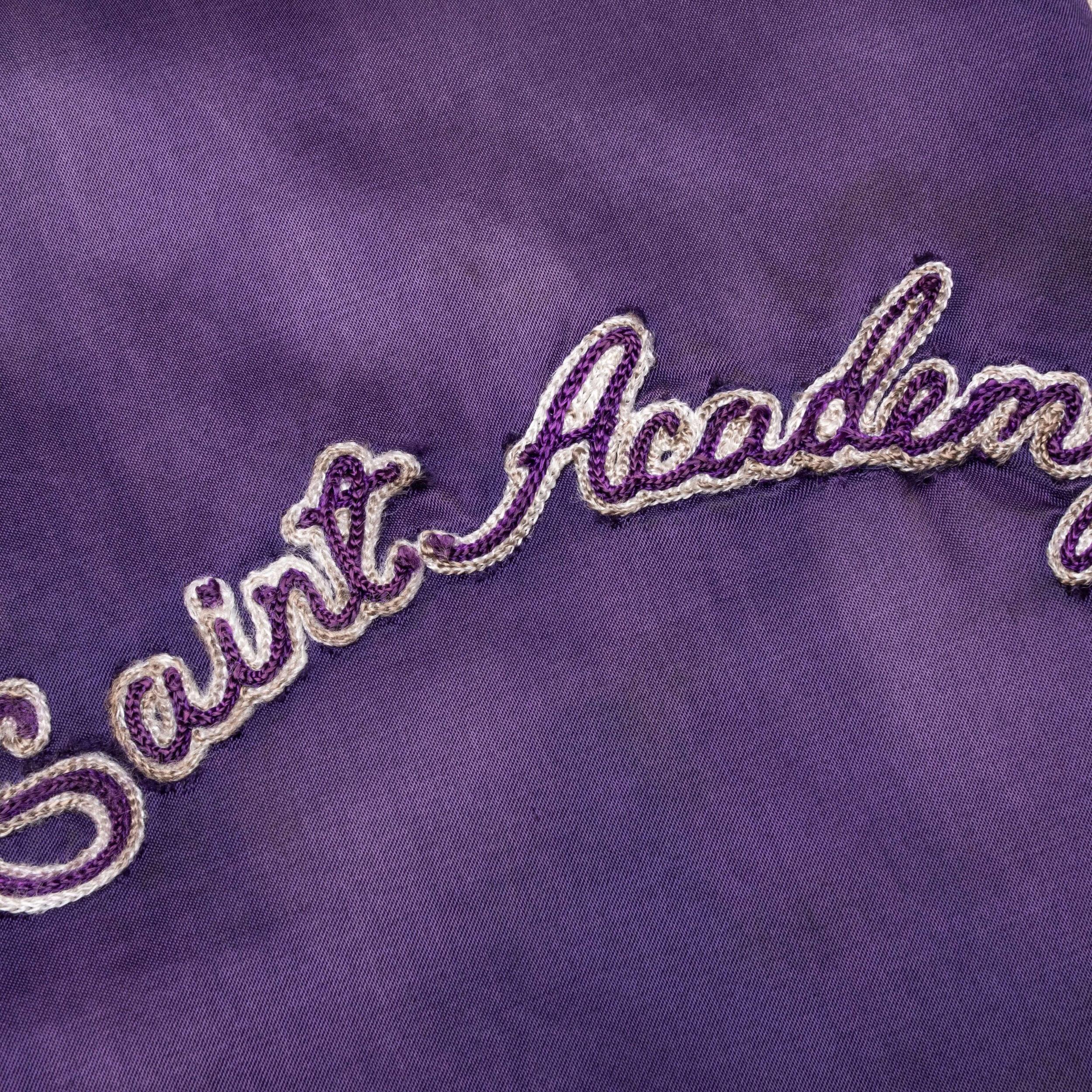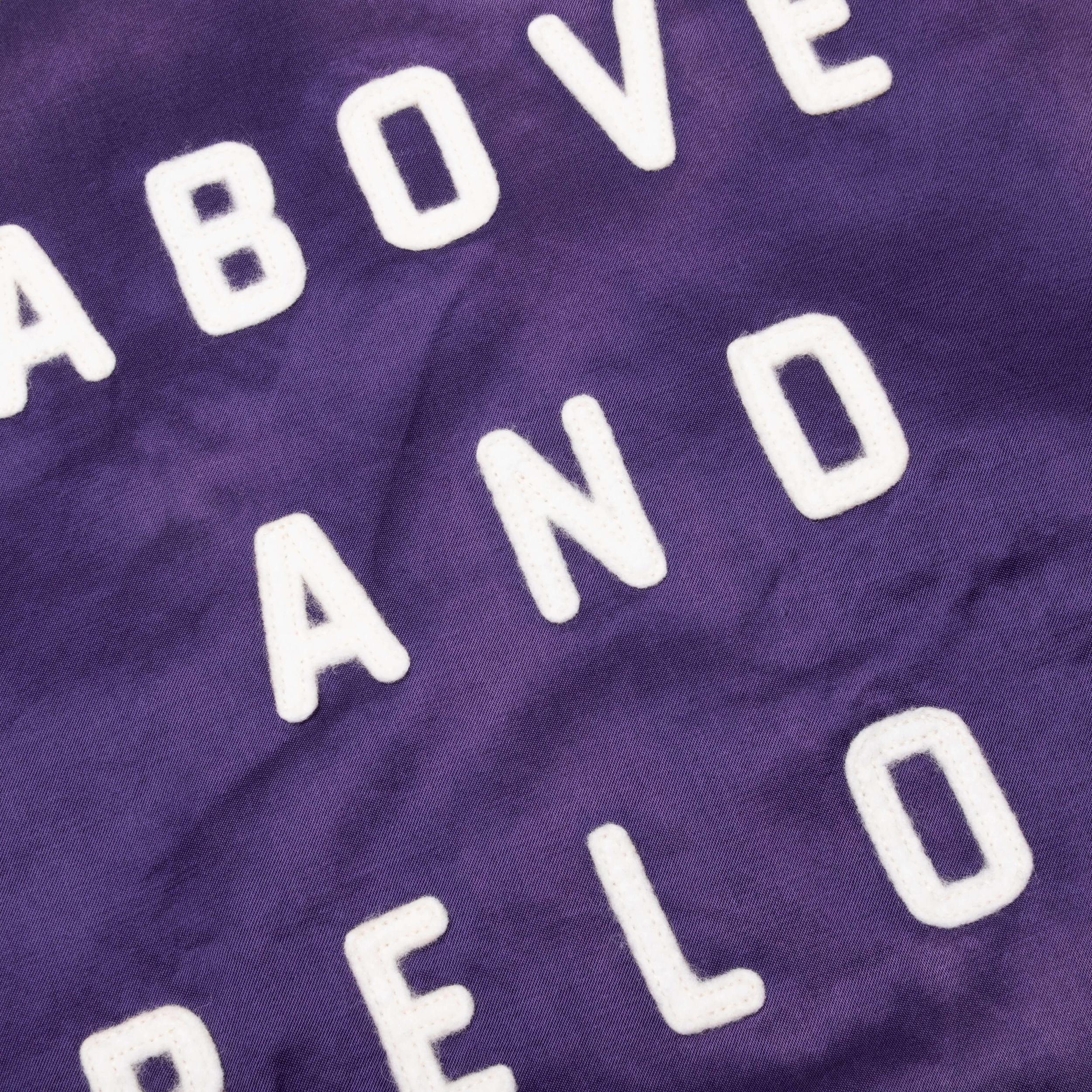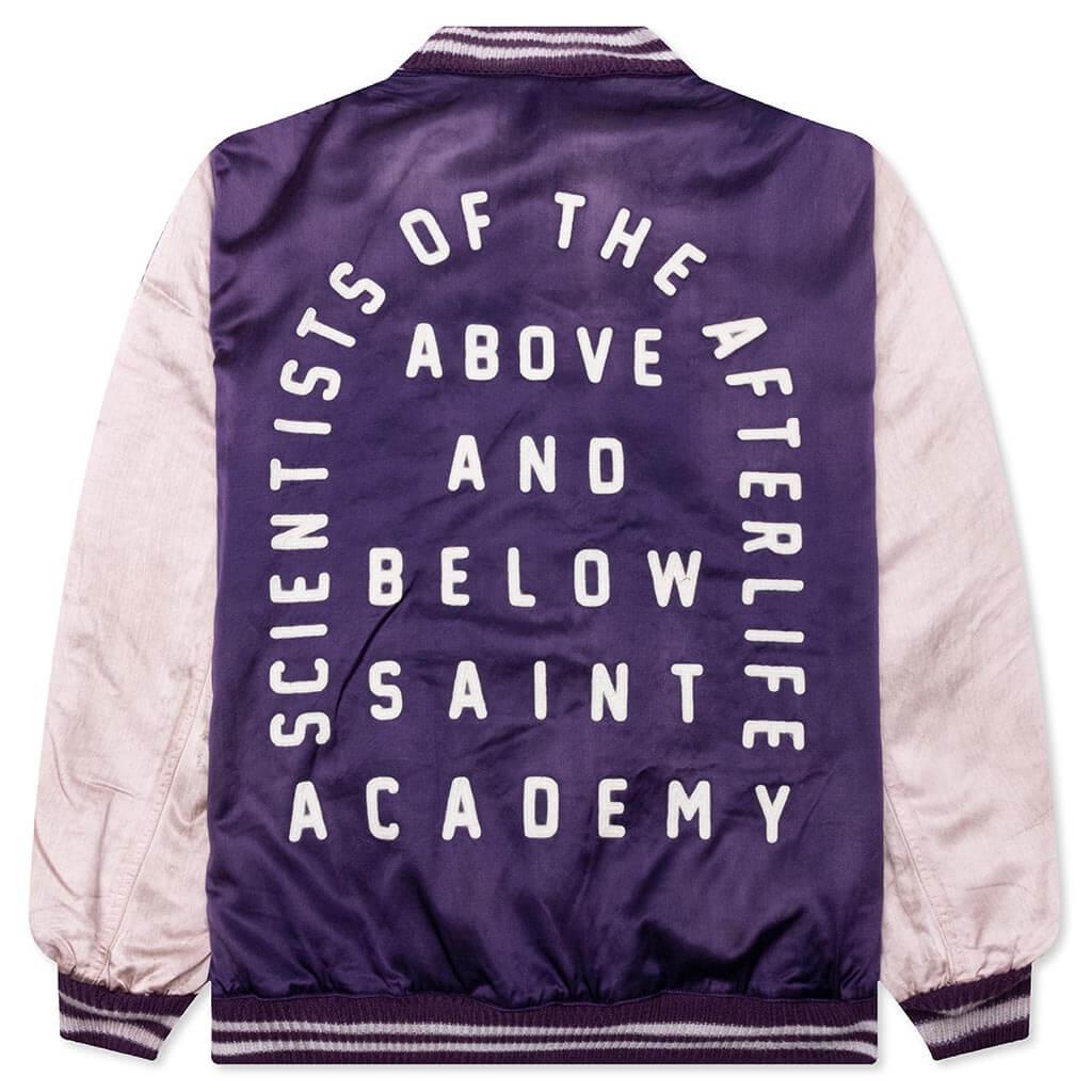 The Saint Michael Stadium Jacket features a nylon construction along with a snap button closure down the front in contrast with white piping. Stitched phrasing and branding reside at the front and rear. The hand pockets and striped ribbed trims complete the rest of the look. 100% nylon Snap button closure Embroidered phrasing Hand pockets Striped ribbed trims Style No: SM-A22-0000-064