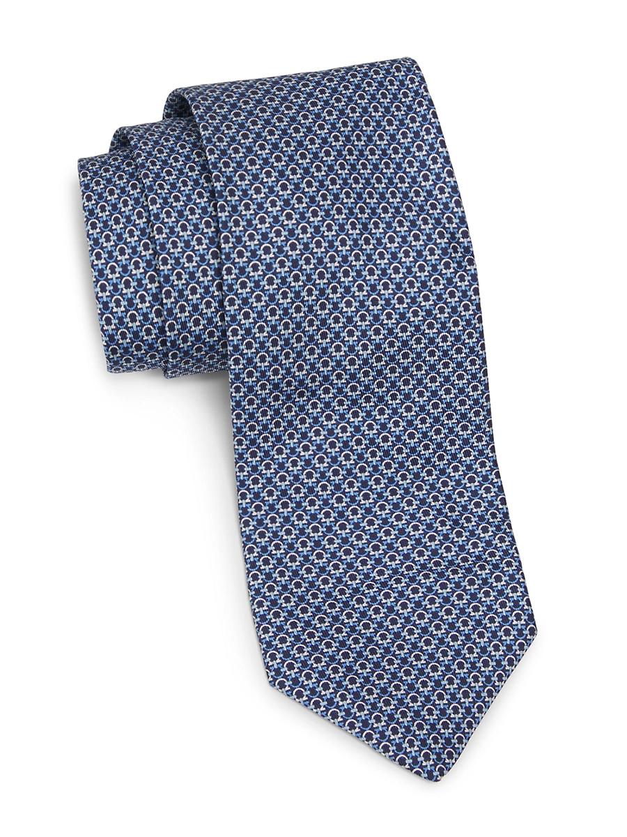 Showcasing a patterned design, this luxe silk tie is elevated with its signature Gancini print. Silk Dry clean Made in Italy SIZE Width, about 3 ABOUT THE BRAND Italian designer FERRAGAMO began his journey in 1927 with a vision of creating the worlds most beautiful shoes. The label expanded to menswear in the 1970s, and remains famed for its made-in-Italy pieces. The craftsmanship inherent in its shoes is also found in accessories like sunglasses, belts and ties. The brands signature Gancini logo-a backwards horseshoe-can be found on its classic loafers and fine leather goods. Men Luxury Coll - Designer Neckwear > Ferragamo > Saks Fifth Avenue > Barneys. FERRAGAMO. Color: Navy.