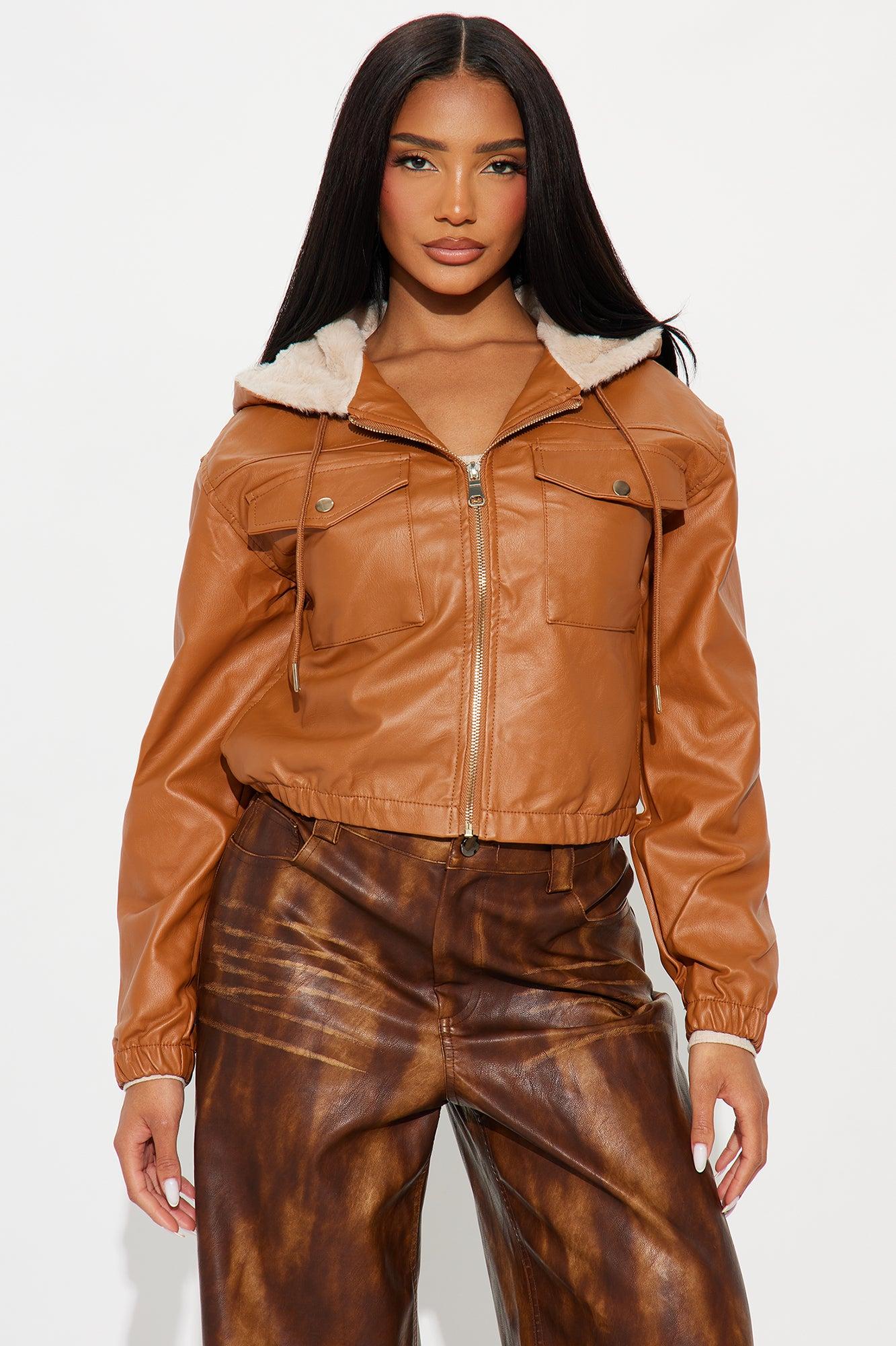 Available In Black, Blush, Camel And Cognac. Faux Leather Jacket Hooded W/ Drawstrings Long Sleeves Zipper Closure Fur Trim Pockets Elastic Hem And Cuffs Fully Lined Shell: 85% Polyester 15% Rayon Coating: 100% Polyurethane Faux Fur Lining: 100% Polyester Lining: 100% Polyester Imported California Proposition 65WARNING: Cancer and Reproductive Harm - www.P65Warnings.ca.gov.