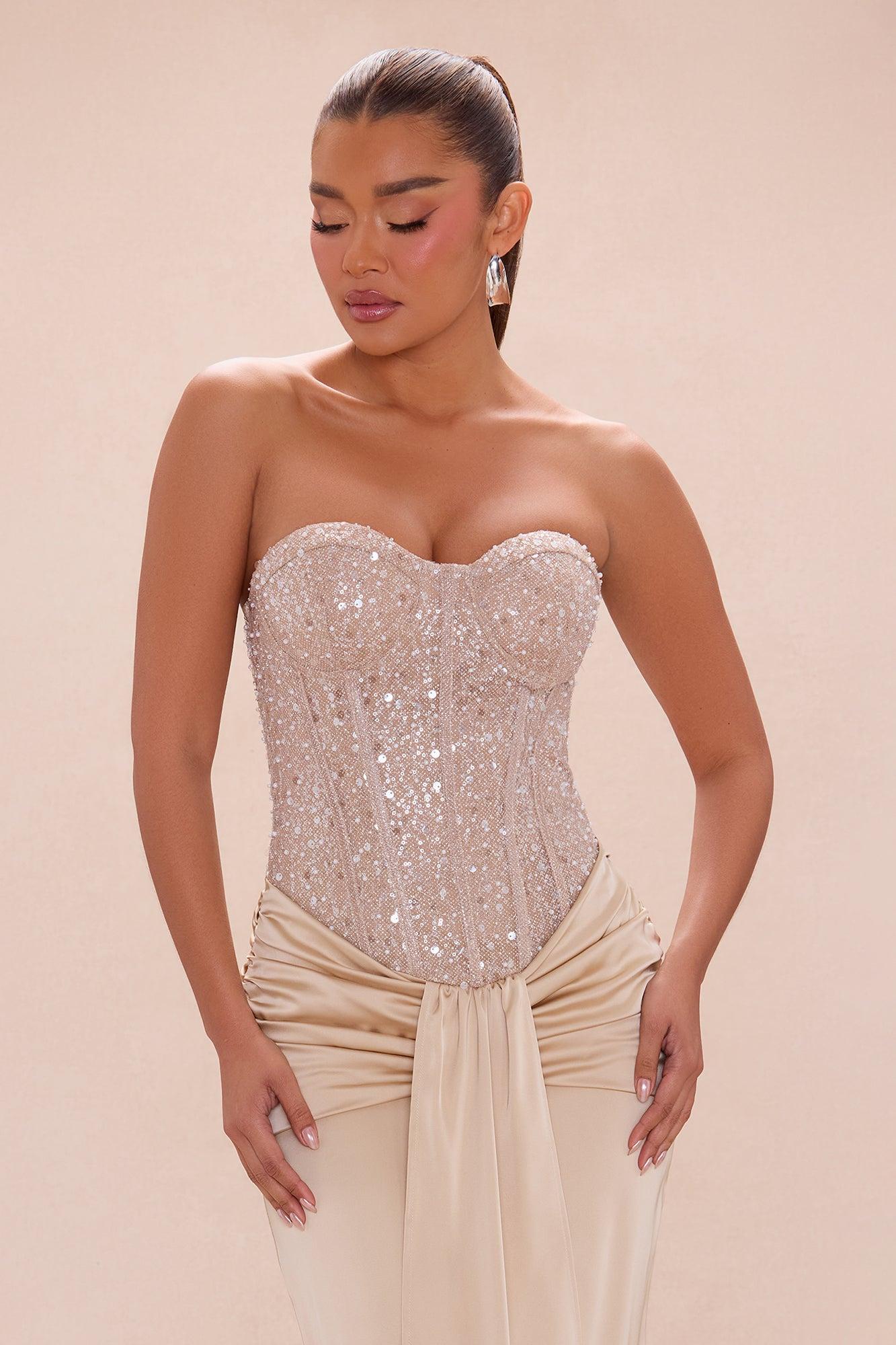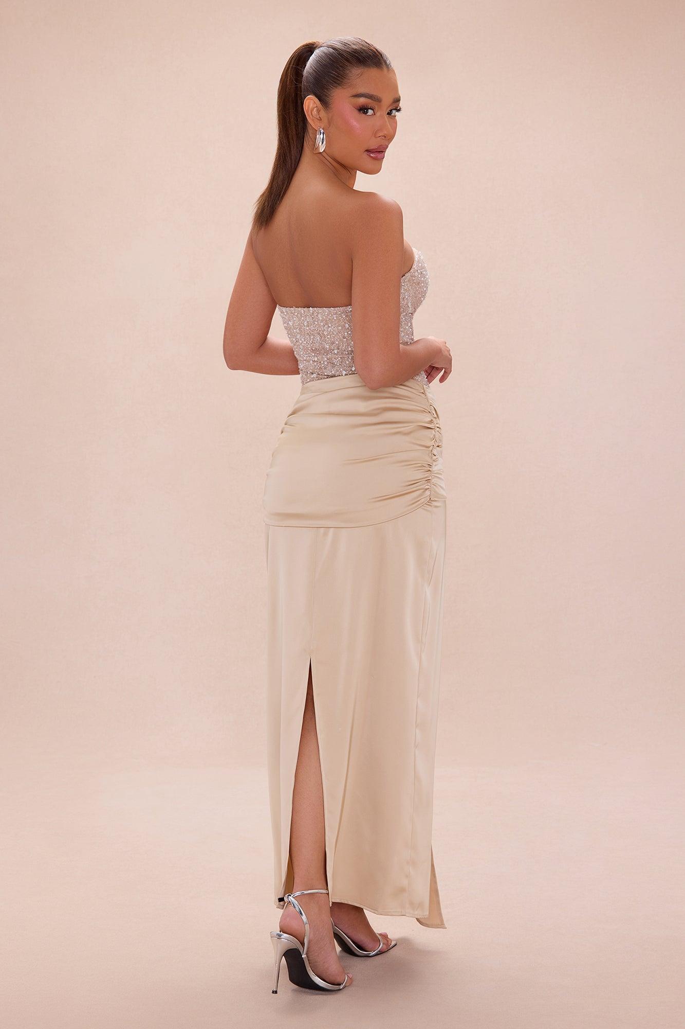 Available In Champagne And Chocolate. Maxi Dress Satin Skirt & Strapless Embellished Top Sweetheart Neckline Grip Tape Padded Bra Cups Corset Waist Ruching Draped Detail Hidden Side Zipper Closure Lined Non Stretch Self/Contrast/Lining: 100% Polyester Imported