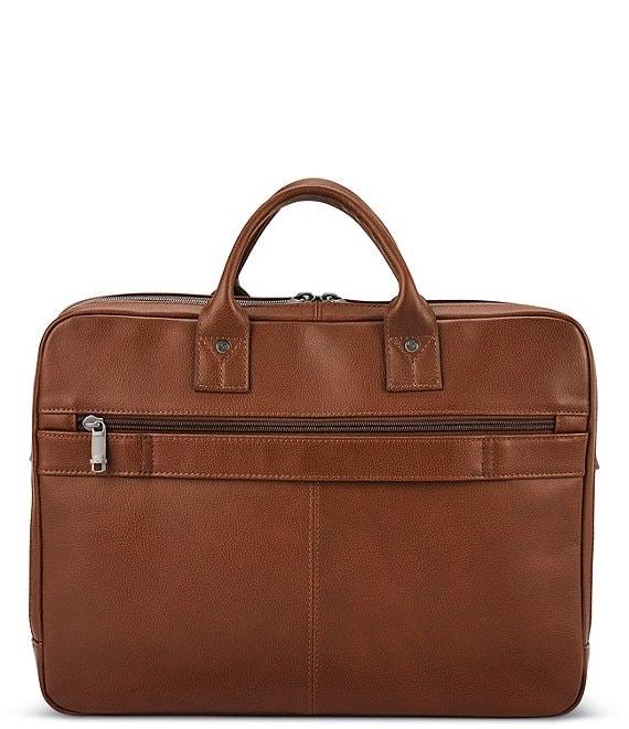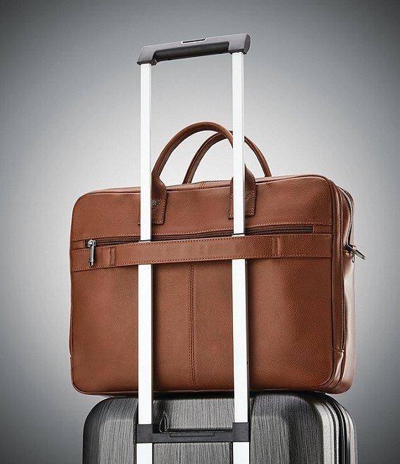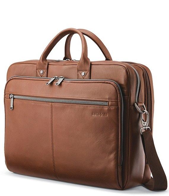 From Samsonite, this brief case features: Leather Full-sized top handle brief Large front organizer pocket with tablet pocket, 2 phone pockets and pen pockets easy access front zip pocket Front compartment padded laptop sleeve (fits up to 15.6" laptop), 3 large padded accessory pockets Back compartment with divider for file organization Large back zip pocket Adjustable, detachable strap with non-slip shoulder pad Smart sleeve for ease of use while traveling Approx. 16" L x 5" W x 12" H, weight 3.11 lbs Imported.