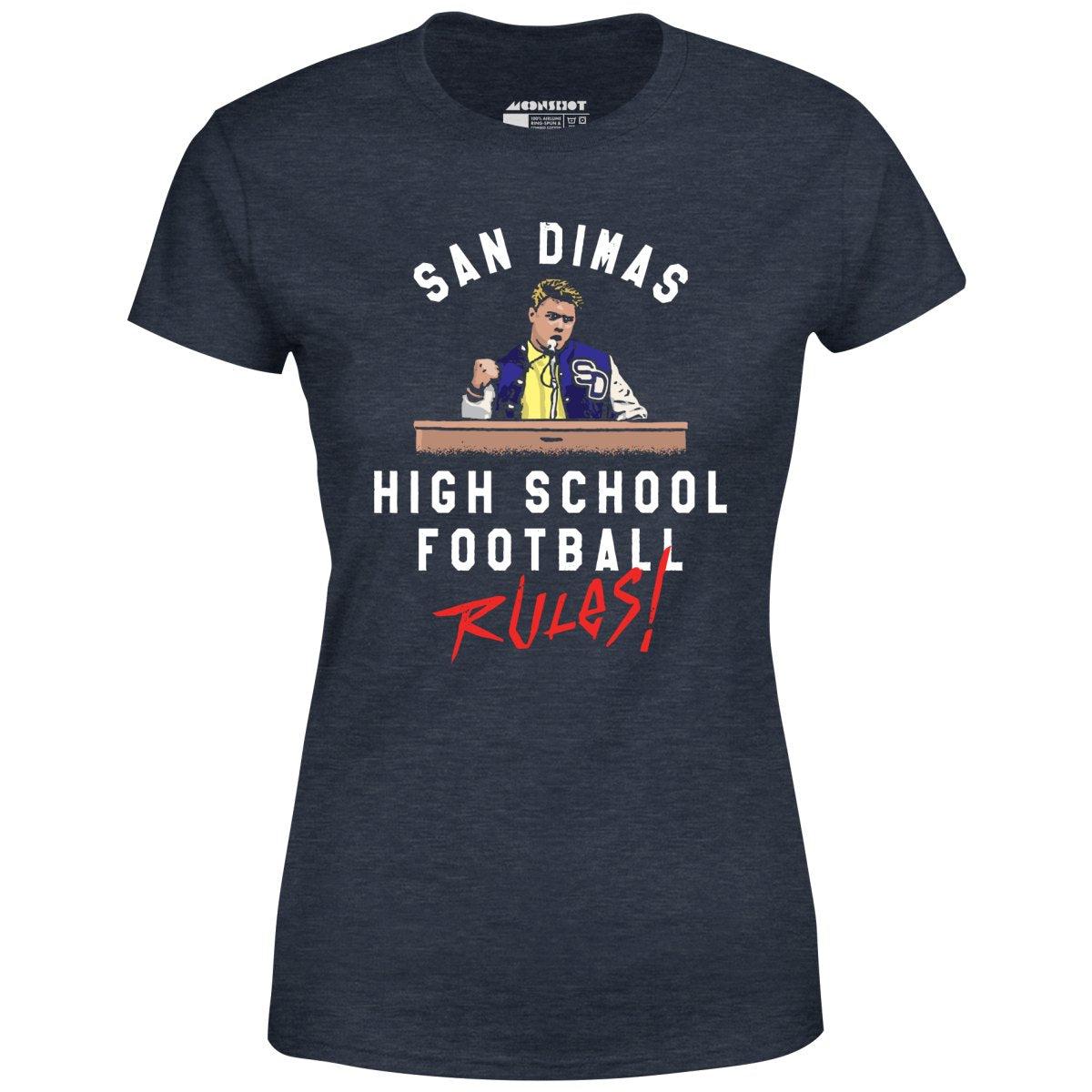 Throwback tribute design inspired by Bill & Ted's Excellent Adventure. Everything is different, but the same... things are more moderner than before... bigger, and yet smaller... it's computers... ...SAN DIMAS HIGH SCHOOL FOOTBALL RULES! Printed on our super soft 100% ringspun & combed cotton women's T-Shirt. Or upgrade to our Luxury 52/48 cotton/poly vintage heather edition for an even softer classic look. We print & ship all of our high quality graphic tees in the USA.