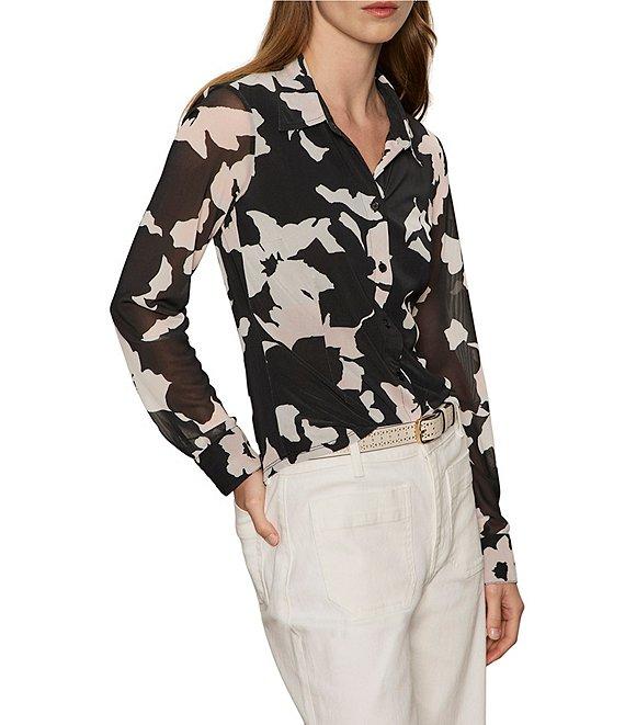 From Sanctuary, this top features: Recycled double mesh fabrication Floral Print Spread collar neckline Long sleeves Button front closure Fitted silhouette Dart detail Lined bodice Approx. 23" length Self: recycled polyester/spandex Lining: rayon Hand wash Imported.