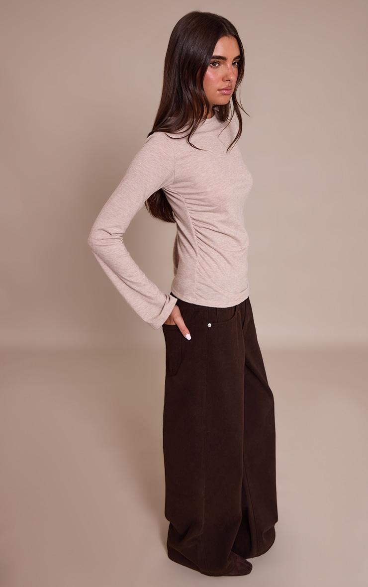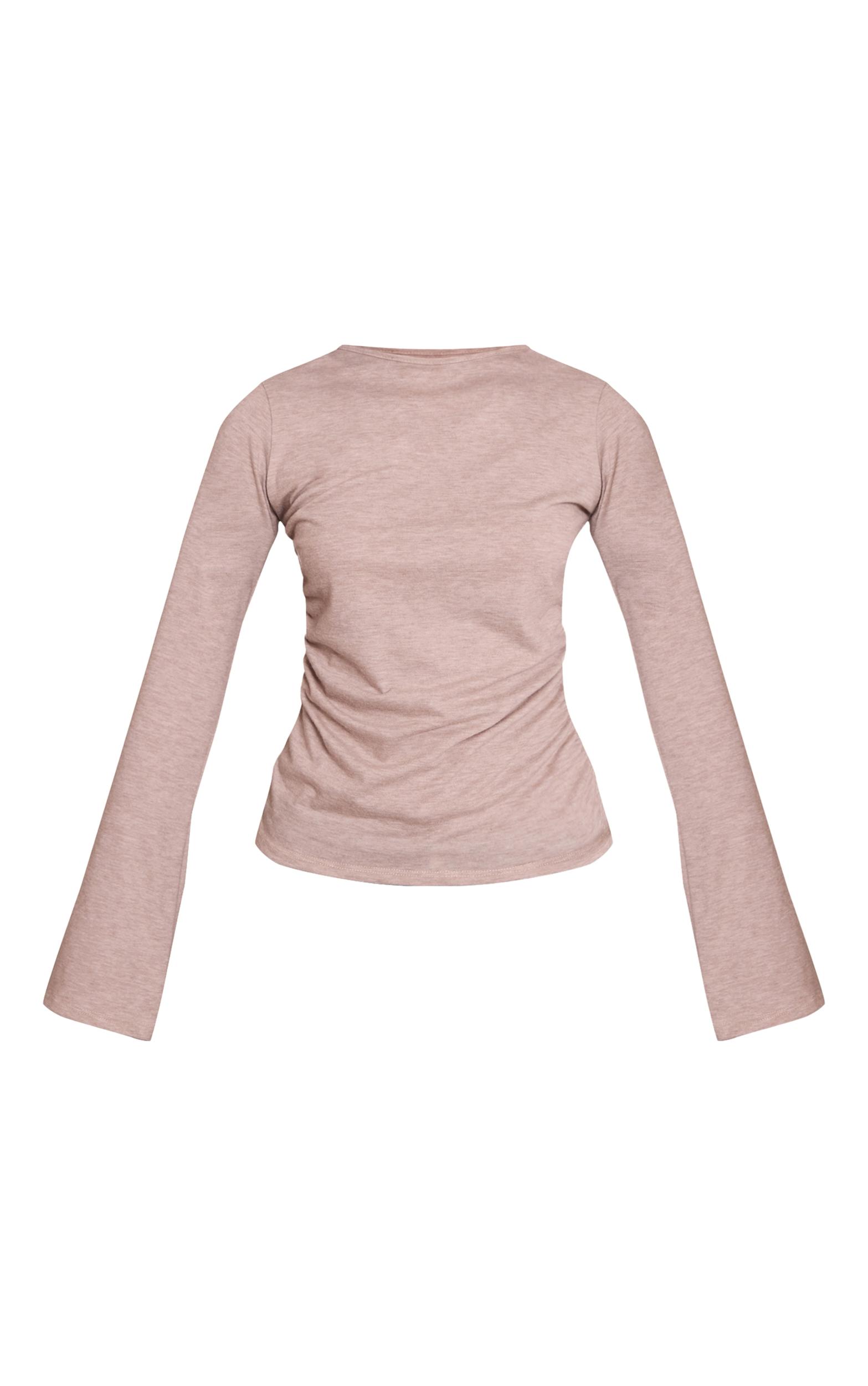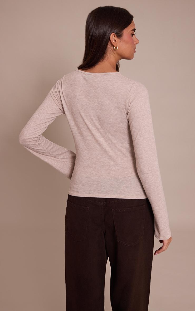 Redefine your core wardrobe with a top that marries subtle detail with effortless wear. The sand marl soft jersey v neck flared long sleeve top introduces impactful simplicity, featuring a gentle v neckline and long sleeves that subtly flare at the cuffs. Artful ruching along the side creates a refined contour, adding visual interest without overpowering the clean aesthetic. Pair this versatile piece with tailored wide-leg pants for a confident daytime look, completing the ensemble with sleek knee high boots. A selection of layered necklaces will naturally enhance the v neckline, affirming an aesthetic that's both knowing and entirely your own.Length approx 48.5cm/19inch (Based on sample size US 4)Model wears size UK 8/ EU 36/ AUS 8/ US 4Model Height - 5ft 7inchp]:!mb-4inch>Brand: PrettyLittleThingCategory: TopsProduct type: Fitted T-ShirtColor: SandMaterial: Cotton JerseyNeckline: V NeckSleeves: LongOccasion: Day