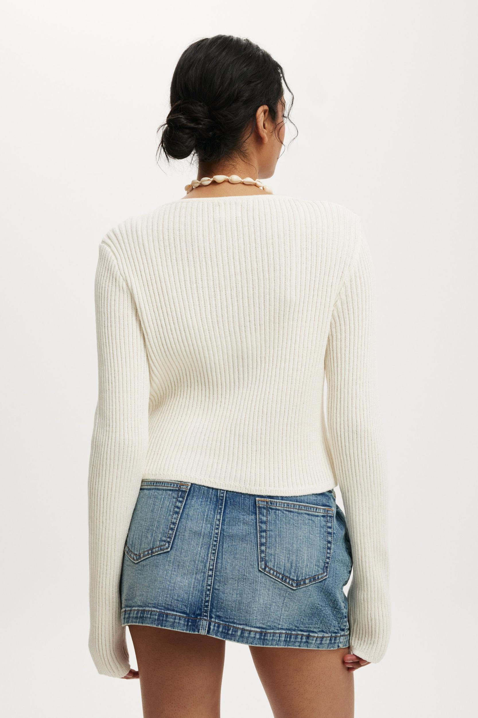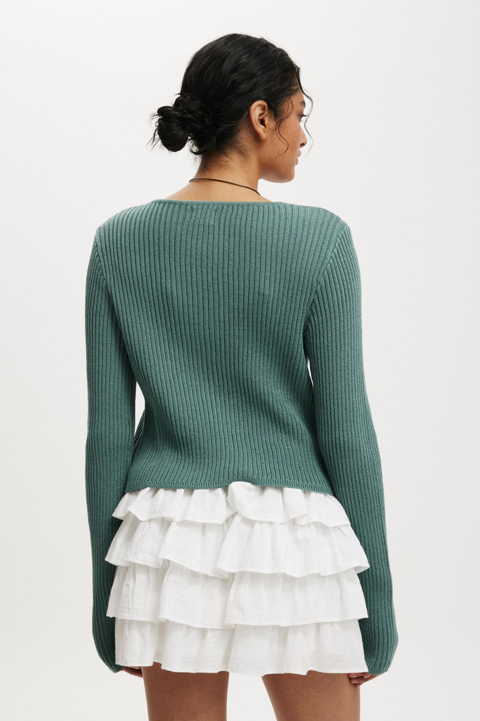 Responsible Materials: 40% Recycled Polyester ,Set in sleeve ,Cropped length ,V-neck ,Double tie front detail ,Long bell sleeves ,Open knit detail ,True knit Main: 60% Cotton, 40% Polyester.