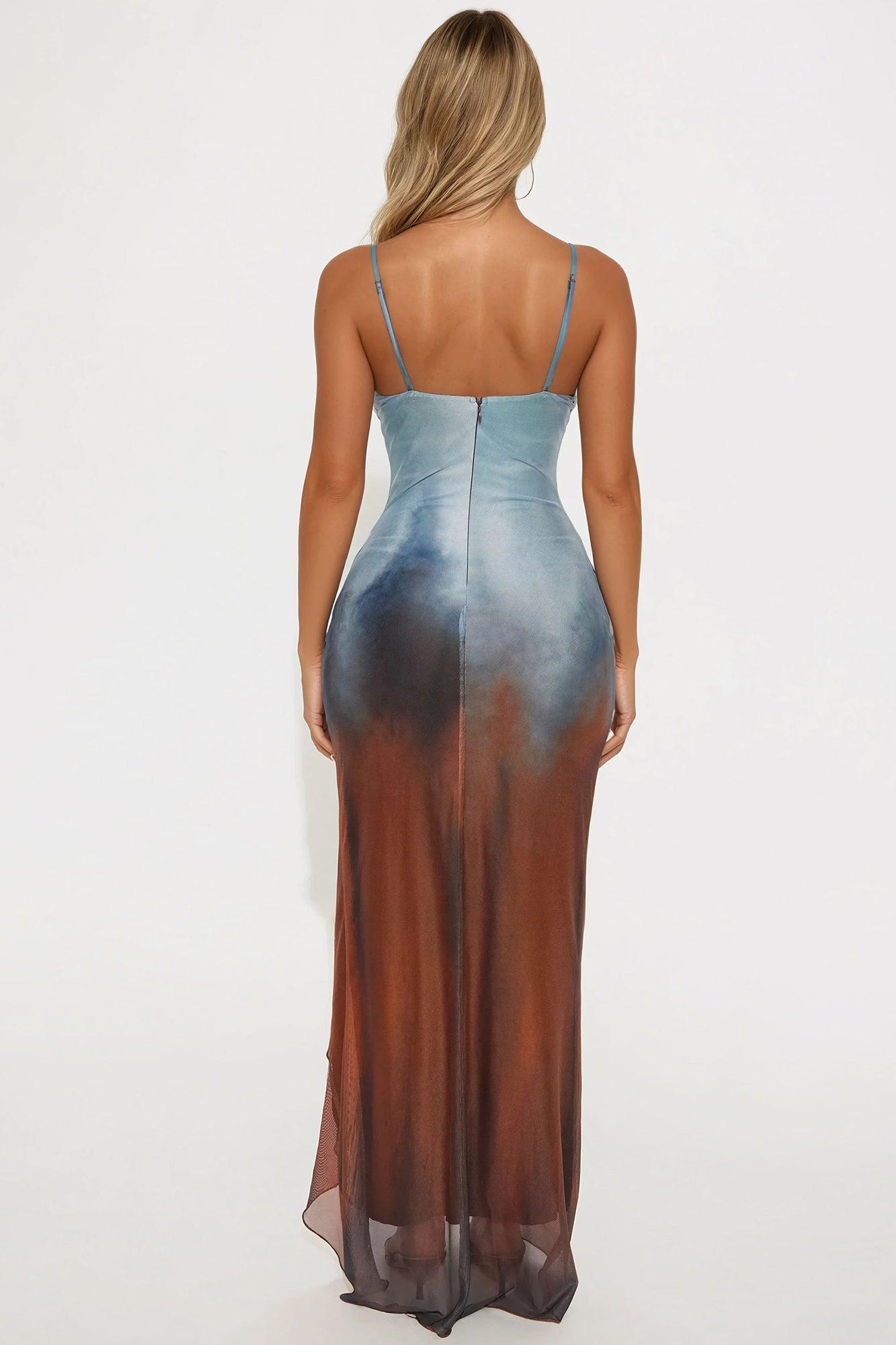 Available In Blue/combo. Mesh Maxi Dress Spaghetti Strap Cowl Neck Padded Slit Ruffle Trim Adjustable Straps Back Hidden Zipper Closure Lined Stretch Disclaimer: Due To The Specialized Dye Process, Each Garment Is Unique Self: 95% Polyester 5% Spandex Lining: 100% Polyester Imported