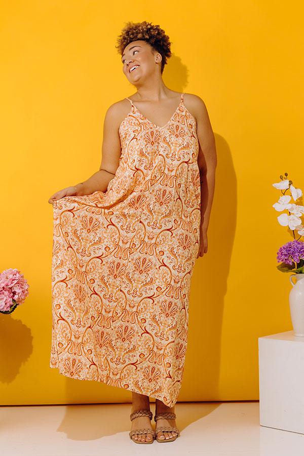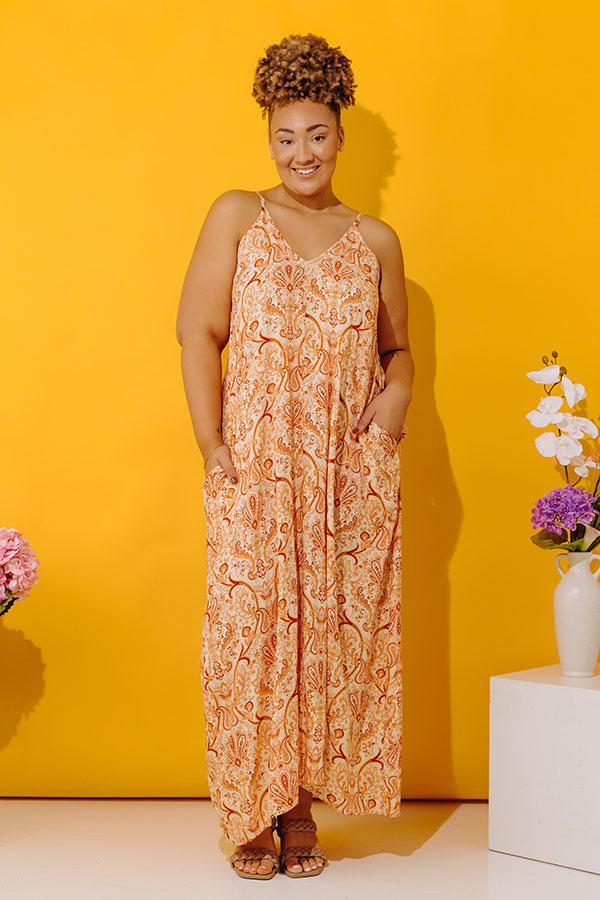 - Take a walk on the sunny side in this beautiful maxi! - Unlined lightweight material paisley print - A v-cut neckline - Adjustable spaghetti straps - A flowy silhouette Measurements 1XL : Bust 48", Hip 62", Length 53", Waist 56". 2XL : Bust 50", Hip 64", Length 53.5", Waist 58". 3XL : Bust 52", Hip 66", Length 54", Waist 60".