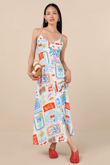 Designed to be packed for summer getaways, this fun multi-print dress flatters every figure with a touch of whimsy. Slender adjustable straps support the V-neck bodice, featuring a button placket that runs through the Basque-style waist and down the flowy, A-line skirt with an ankle-grazing midi hem. Smocking at back and a hidden side zipper/clasp.