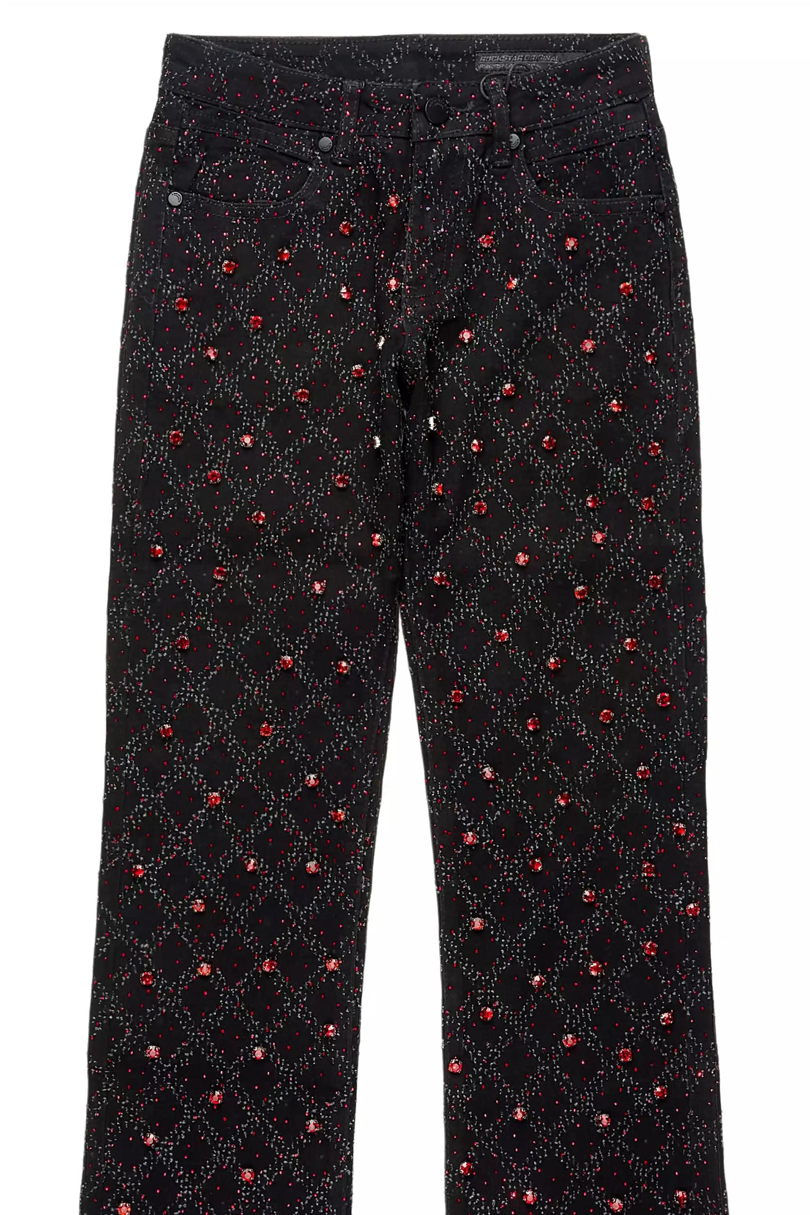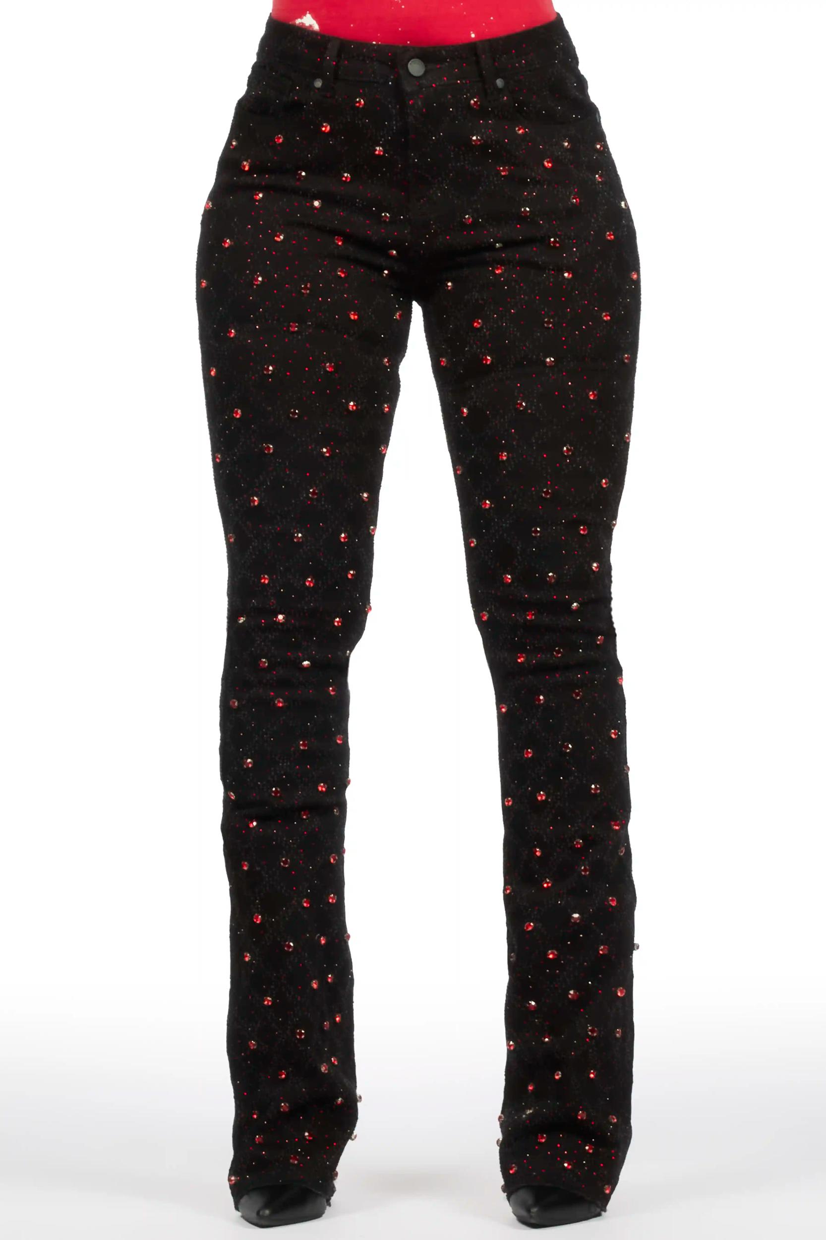 An urban stacked flare denim jean for women in black and red. Designed with custom rhinestone detailing and extra long legs for a must-cop streetwear staple piece. Zip fly with button closure 5-pocket build High-waisted silhouette Fitted through the hip Custom rhinestone designing Flare leg openings Stacked construction 36" inseam *NOTE: These jeans are purposefully designed with extra long legs so the fabric properly bunches at the hem, creating the stacked flare style.