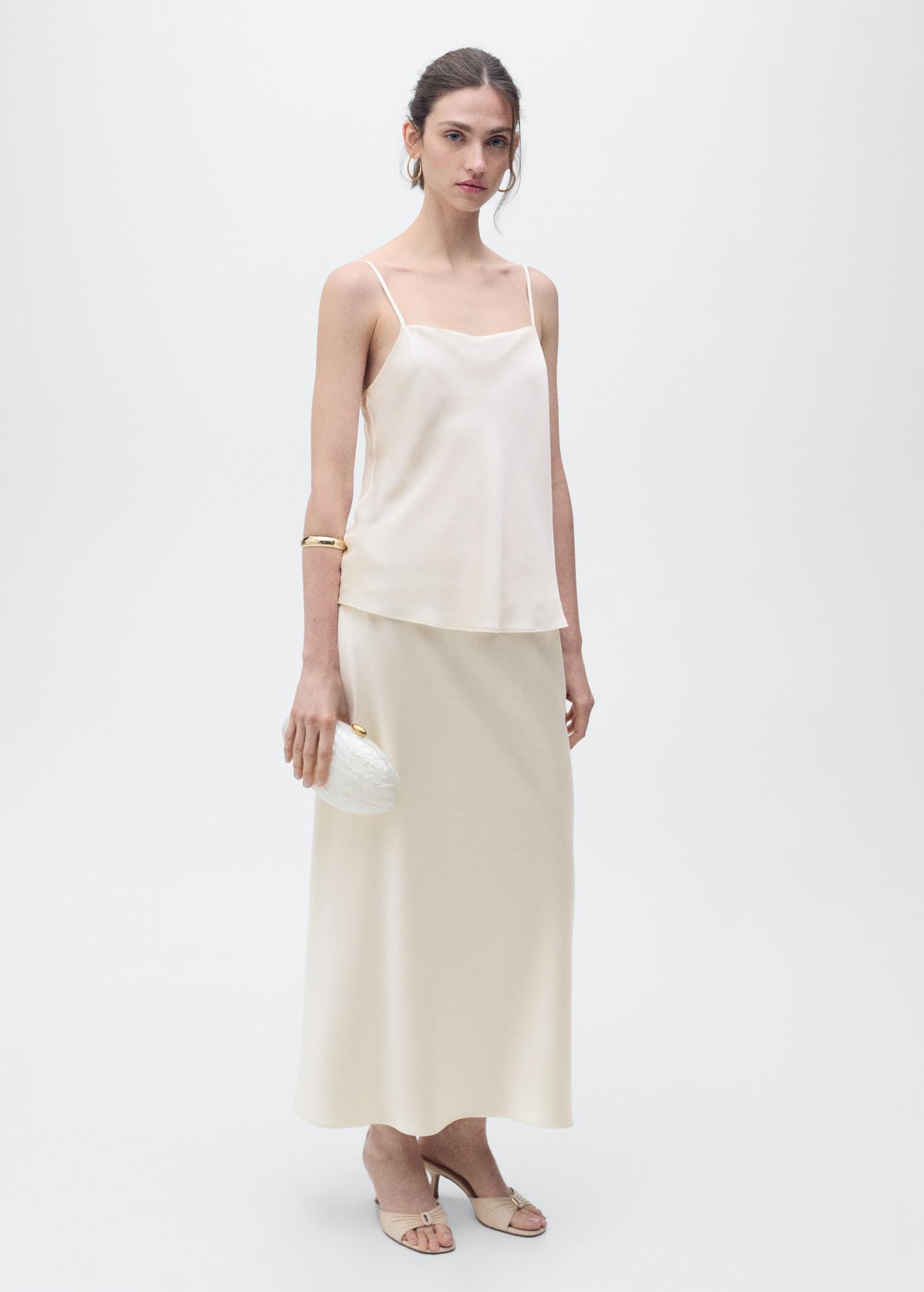 Satin fabric. Straight design. Low neckline. Draped neckline. Thin Straps. No closure. Inner lining. Party and ceremony collection. This garment belongs to our event collection, designed to make you the perfect guest at any party, wedding or ceremony. Side length 14.21 in. Back length 13.39 in