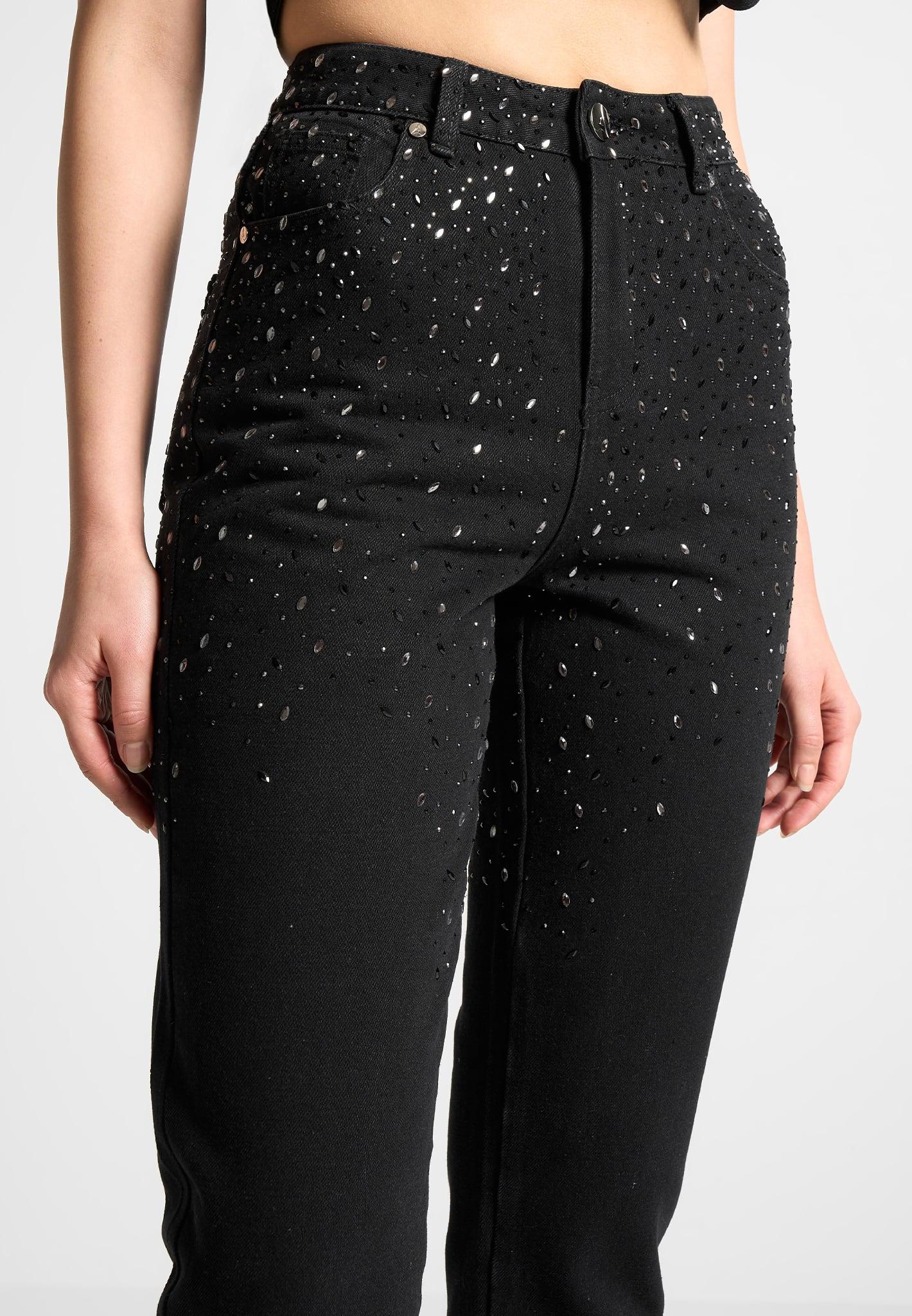 These jeans are specifically designed with a flared silhouette, featuring modern sparkling rhinestone embellishments for a unique and eye-catching look. Versatile and perfect for many occasions, these jeans will make sure you stand out! High Waisted Jeans Silhouette Fit and Flare Shape Scattered Rhinestone Embellishment Functional Fly Zip Fastening Front Pockets Vegan Leather Manière De Voir Branded Patch Silver Manière De Voir Eiffel Button 100% Cotton 13ozAlways check the care label for wash instructions.