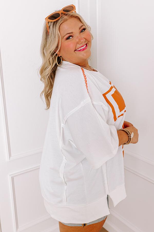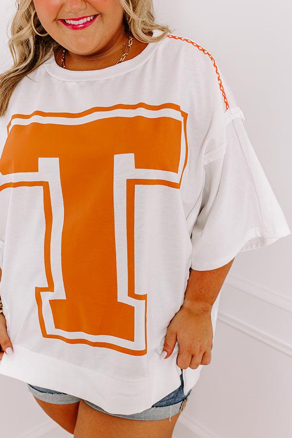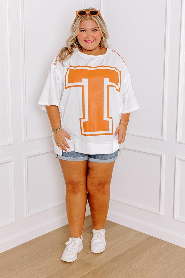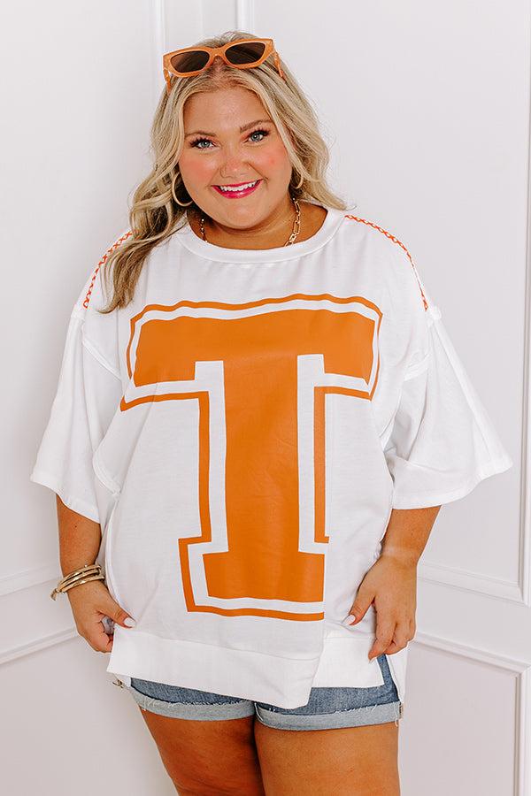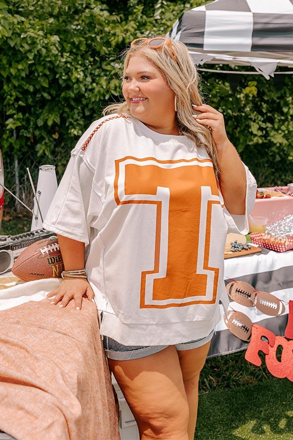 - Show your state some love with this trendy oversized top! Whether you're cheering on the team or hanging out with friends, it's the perfect choice for casual-cute style. - Unlined lightweight sweatshirt material with unfinished accent seams - 'T' lettering on the front - A round neckline - Short, loose sleeves - Embroidered detailing at the shoulders - An oversized silhouette that ends in an uneven hemline with side slit accents - This piece is perfect for fans of Tennessee, Texas, and more! Measurements 1XL : Bust 64", Hip 56", Length 27", Sleeve Length 10", Waist 58". 2XL : Bust 66", Hip 58", Length 28", Sleeve Length 10", Waist 60". 3XL : Bust 68", Hip 60", Length 28", Sleeve Length 10.5", Waist 62".