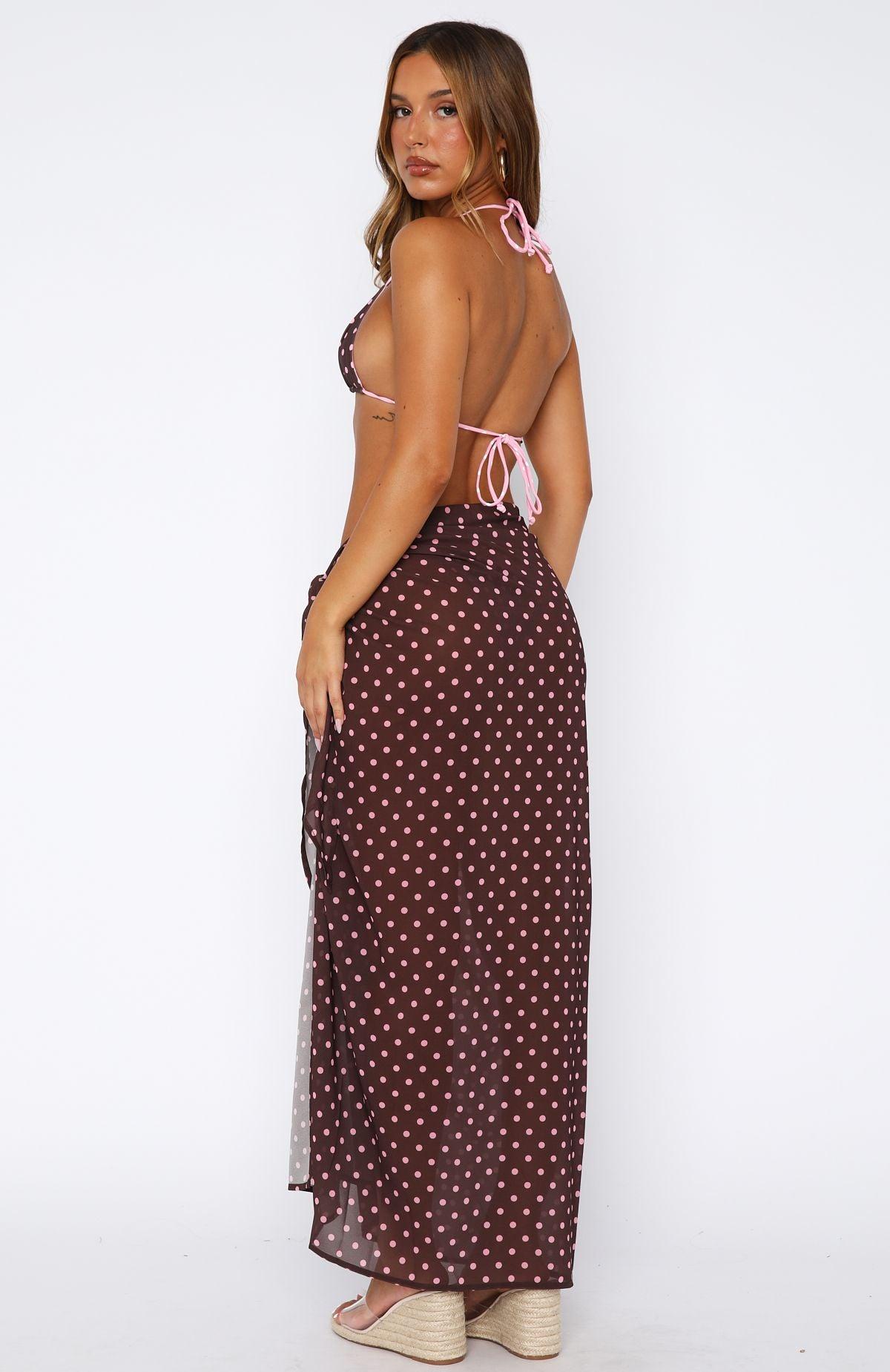WHITE FOX SWIM Get ready to make waves in our Seaforth Sarong Choc/Pink Polka Dot. This sarong is maxi in length with sheer light weight fabric with an adjustable fit, worn best tied to the side. Pair with one of our favourite White Fox bikini's to complete the look. Dekota is 172cm Ash is 166cm 100% Polyester