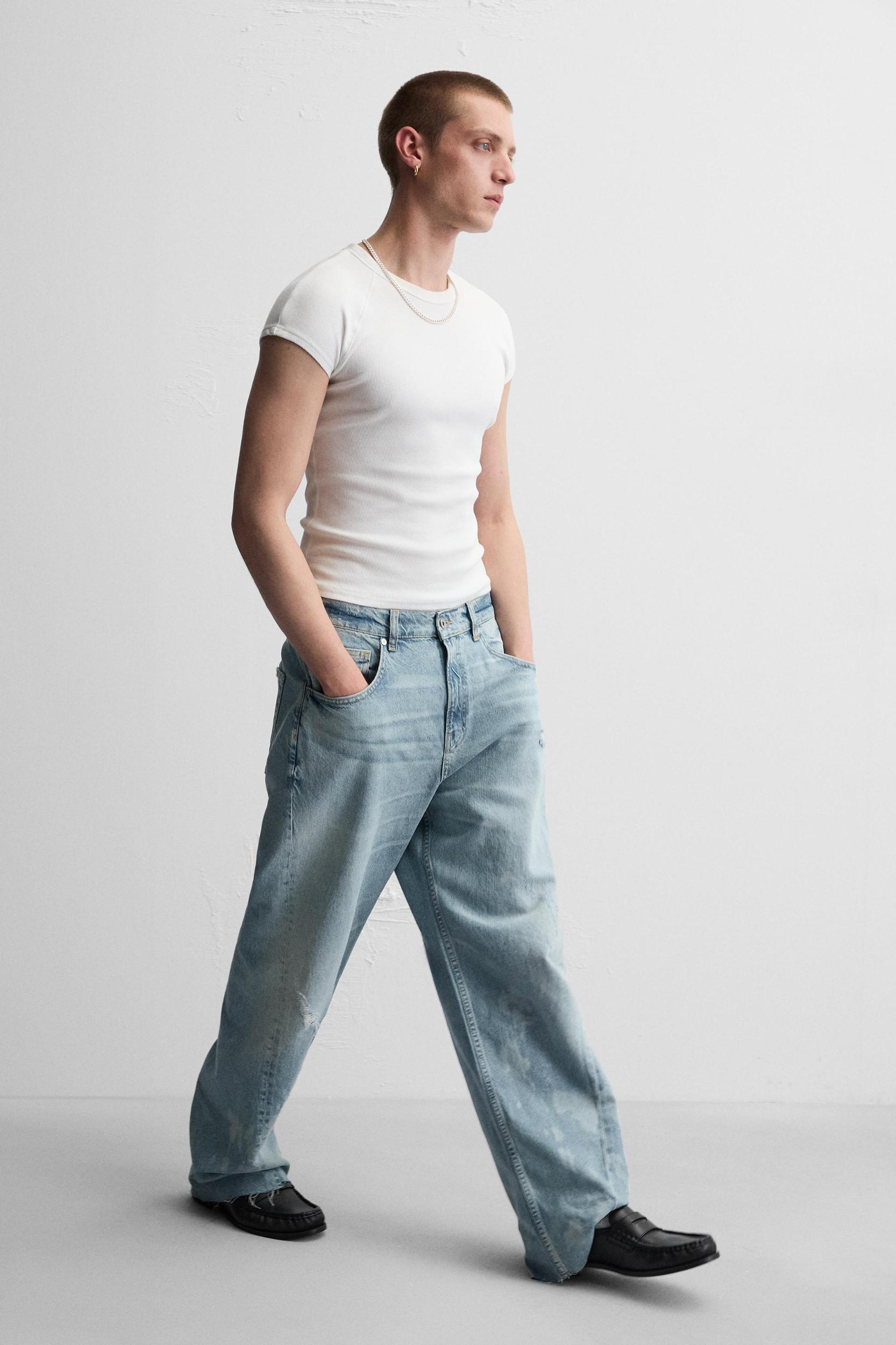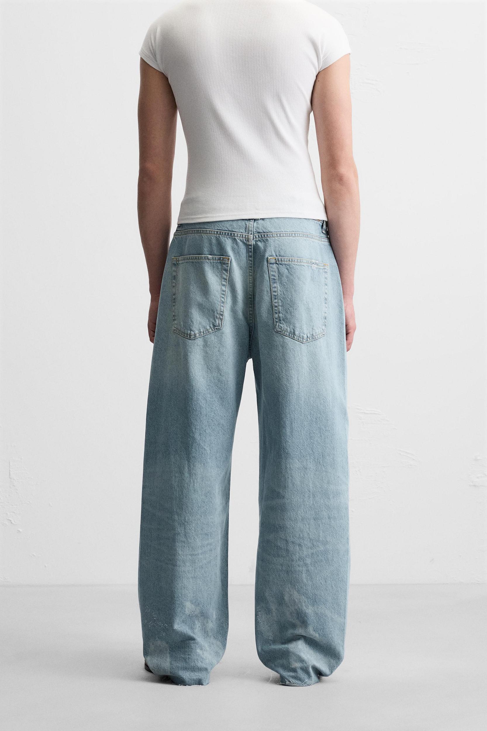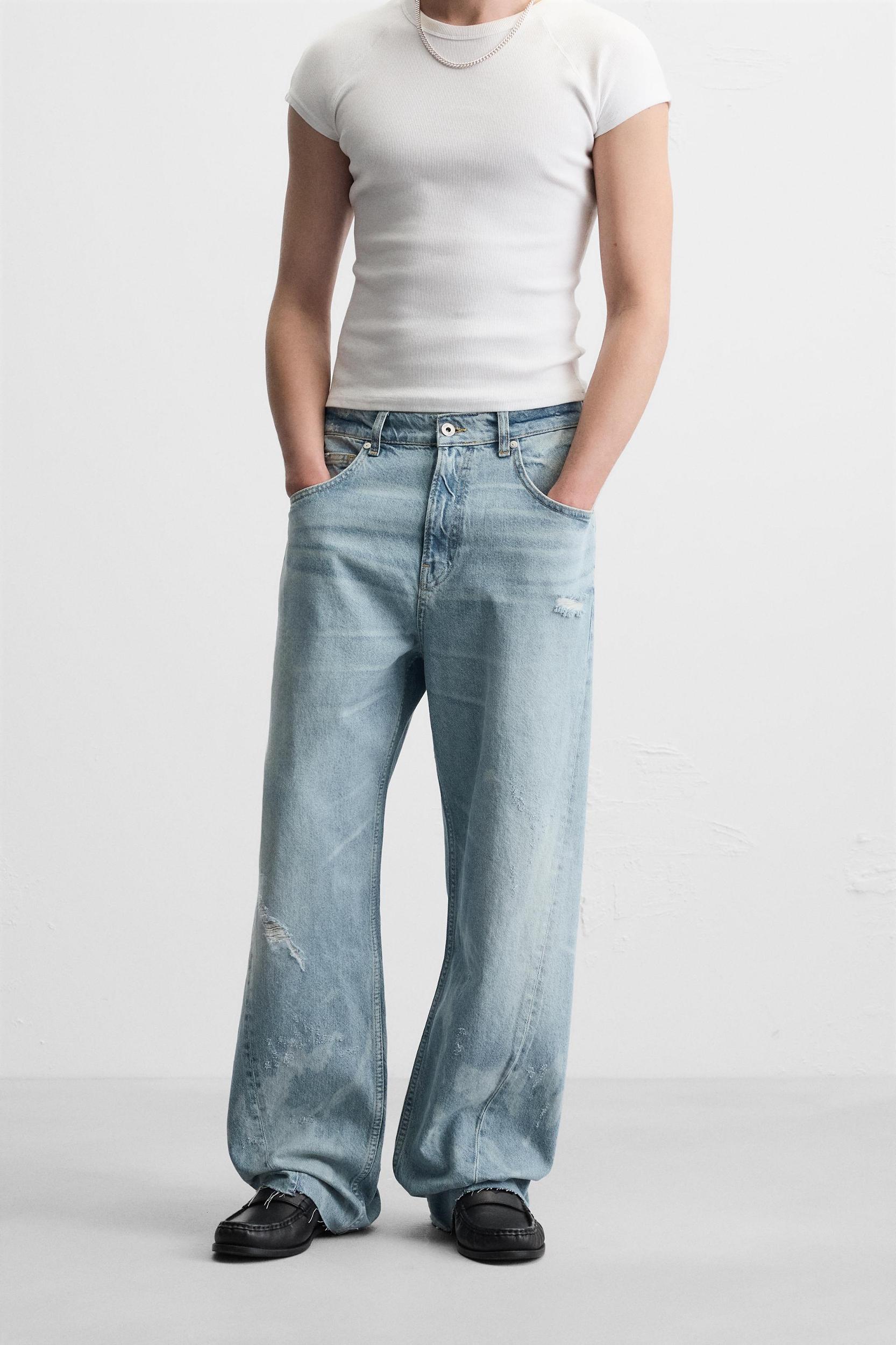Baggy fit jeans. Five pockets. Legs with seams turned forward. Washed effect. Irregular hem finish. Front zip and button closure.