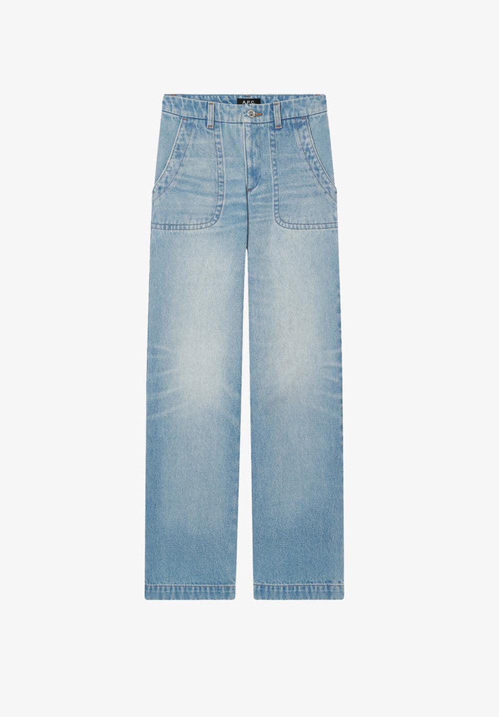 - Soft material. - Straight cut, envelops the hips. - Rather high waist. - Wide, long leg. - Zip fly. - Topstitched pocket outlines. - Large topstitched hem. - Caramel topstitching. - 100% recycled cotton.- Same fabric also available in: Elisabeth jeans