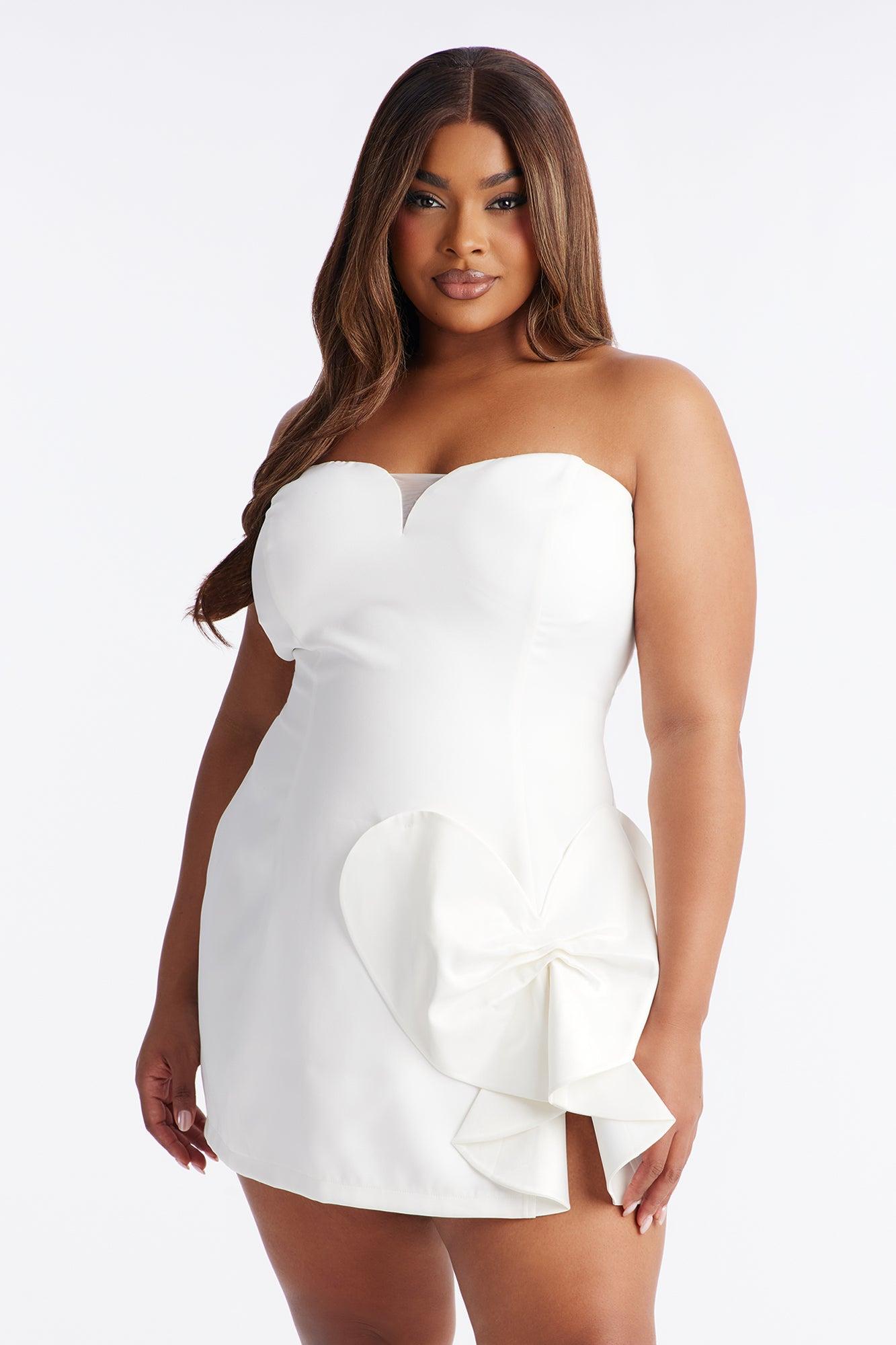 Available In Red And White. Crepe Woven Mini Dress Straight Neckline Strapless Mesh Cut Out Padded Bust 3D Applique Back Zipper Closure Lined Length Measured Flat = 26" Self: 95% Polyester 5% Spandex Contrast1: 100% Nylon Contrast2: 95% Polyester 5% Spandex Lining: 100% Polyester