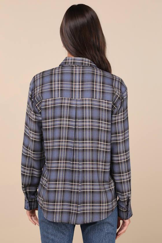 Greet fall in style with the Lulus Seasonal Concept Blue Plaid Flannel Button-Up Top! Lightweight woven flannel fabric boasts a classic plaid pattern, shaping long sleeves with button cuffs and a collared neckline. A functional button placket accents the front of the relaxed bodice, continuing down to rounded hems.