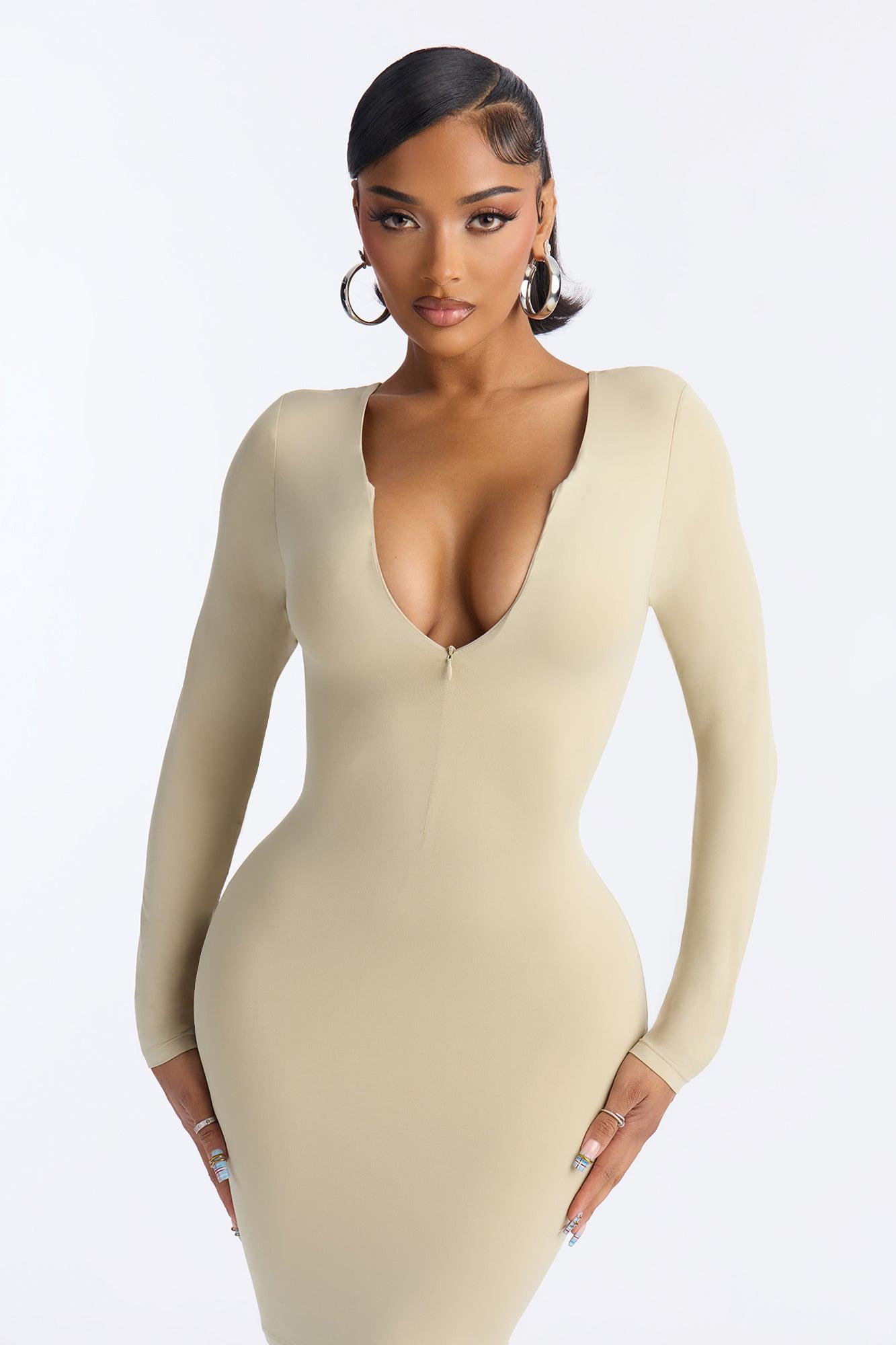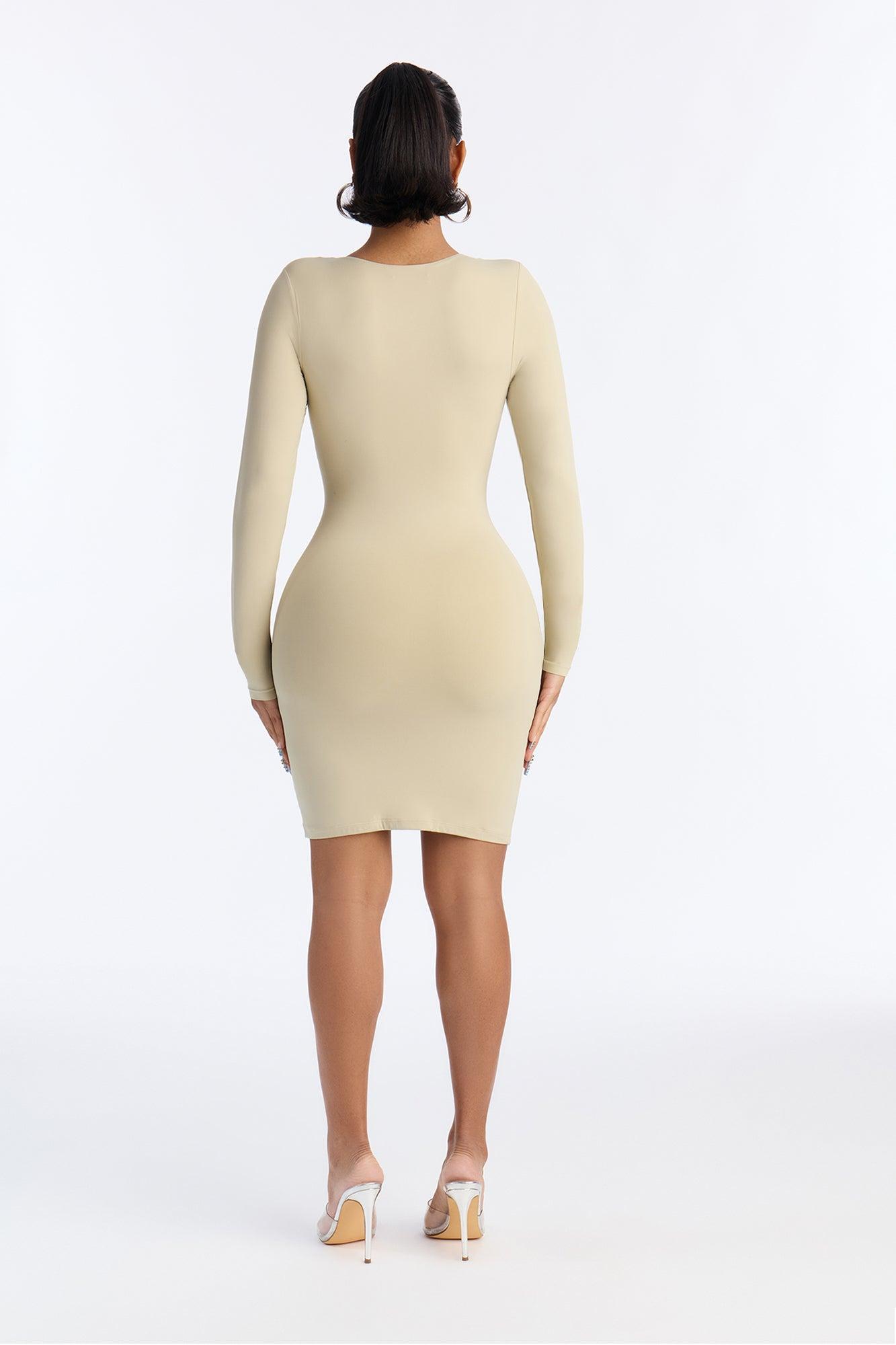 Second Skin Double Lined Zip Front Long Sleeve Mini Dress - Stone Female