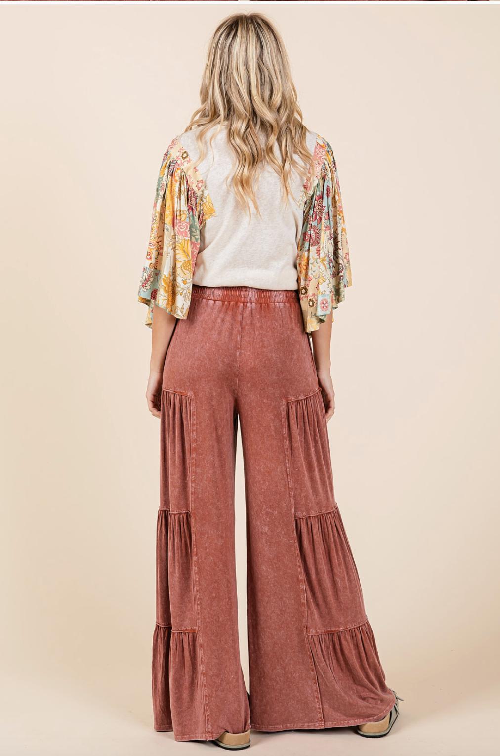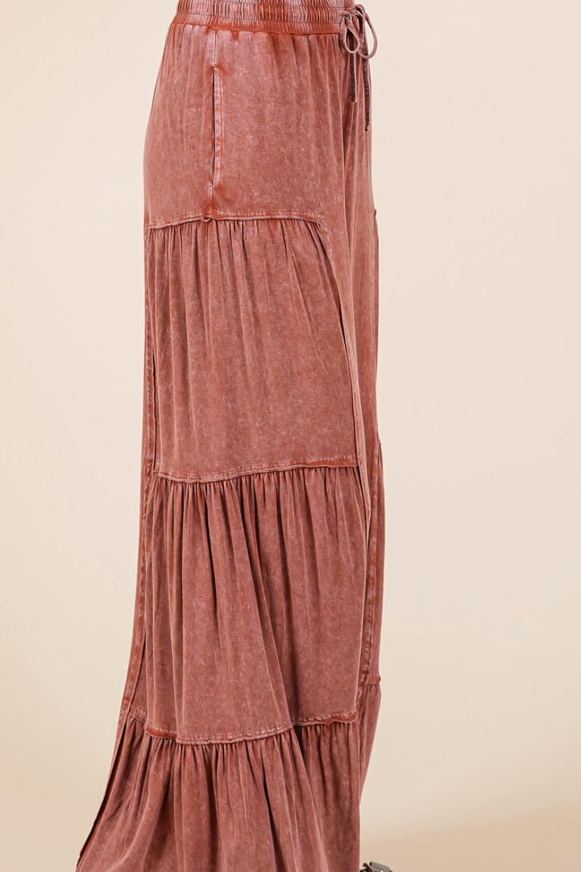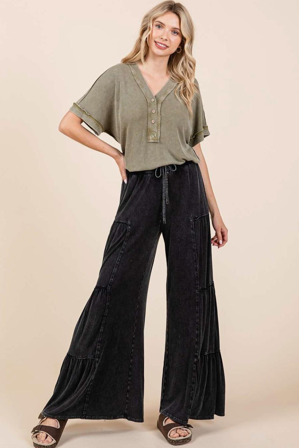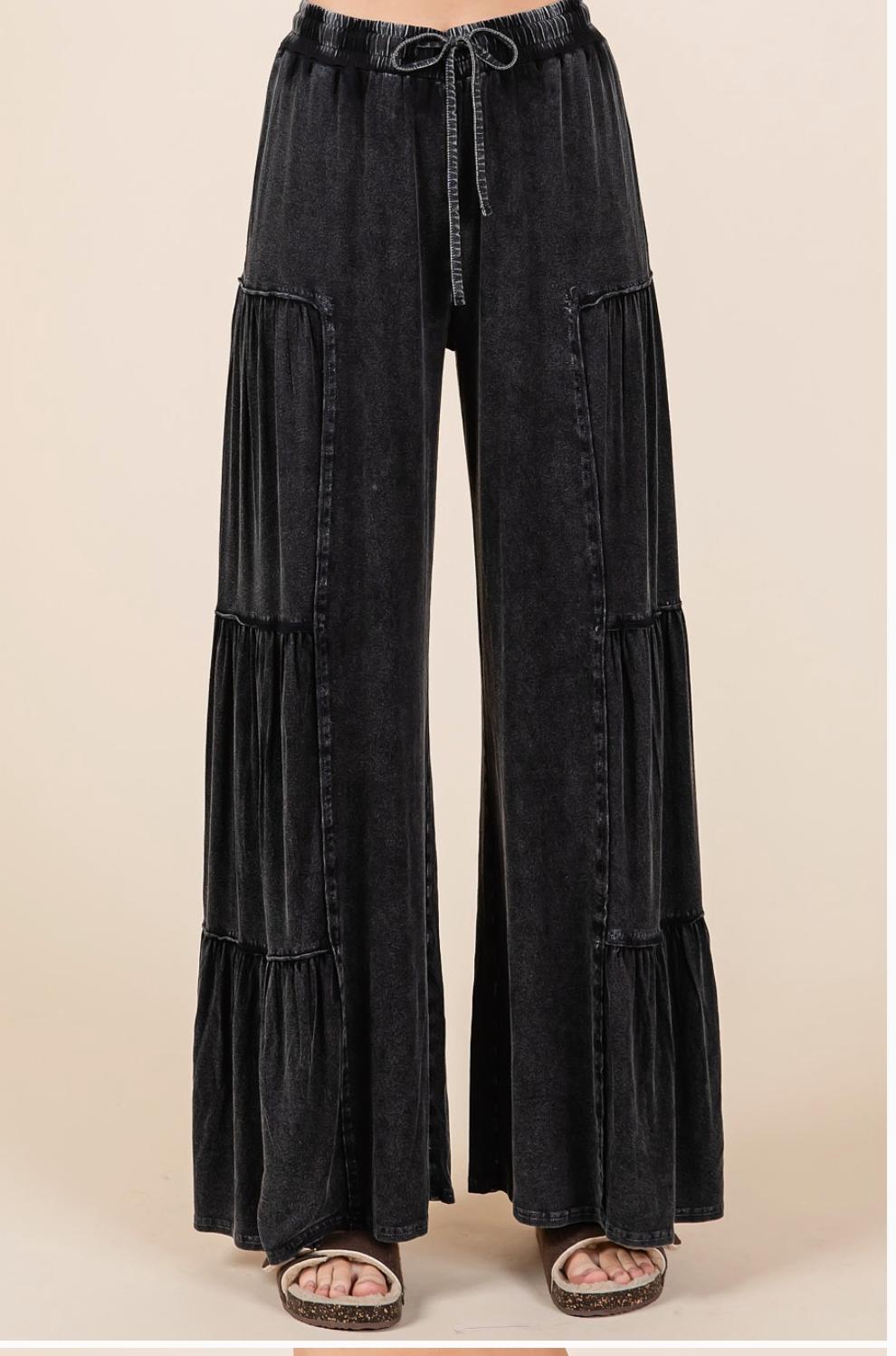 MINERAL WASHED LIGHTWEIGHT KNIT FABRIC - ELASTIC WAIST WITH DRAWSTRING TIE - TIER DETAIL ON LEG WITH RUFFLE/PLEAT - EXPOSED SEAM DETAIL - MID RISE - WIDE LEG PANTS - FULL LENGTH