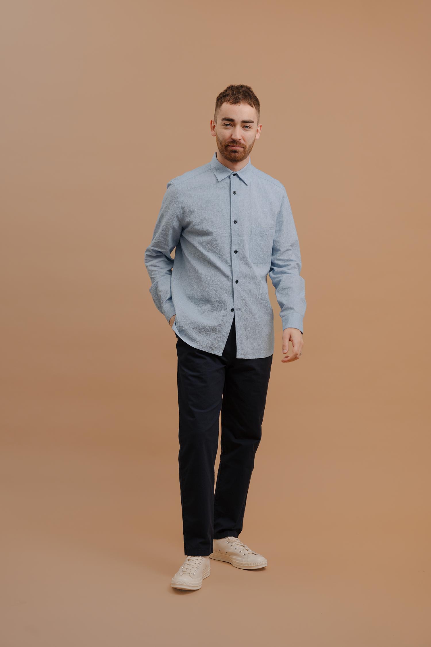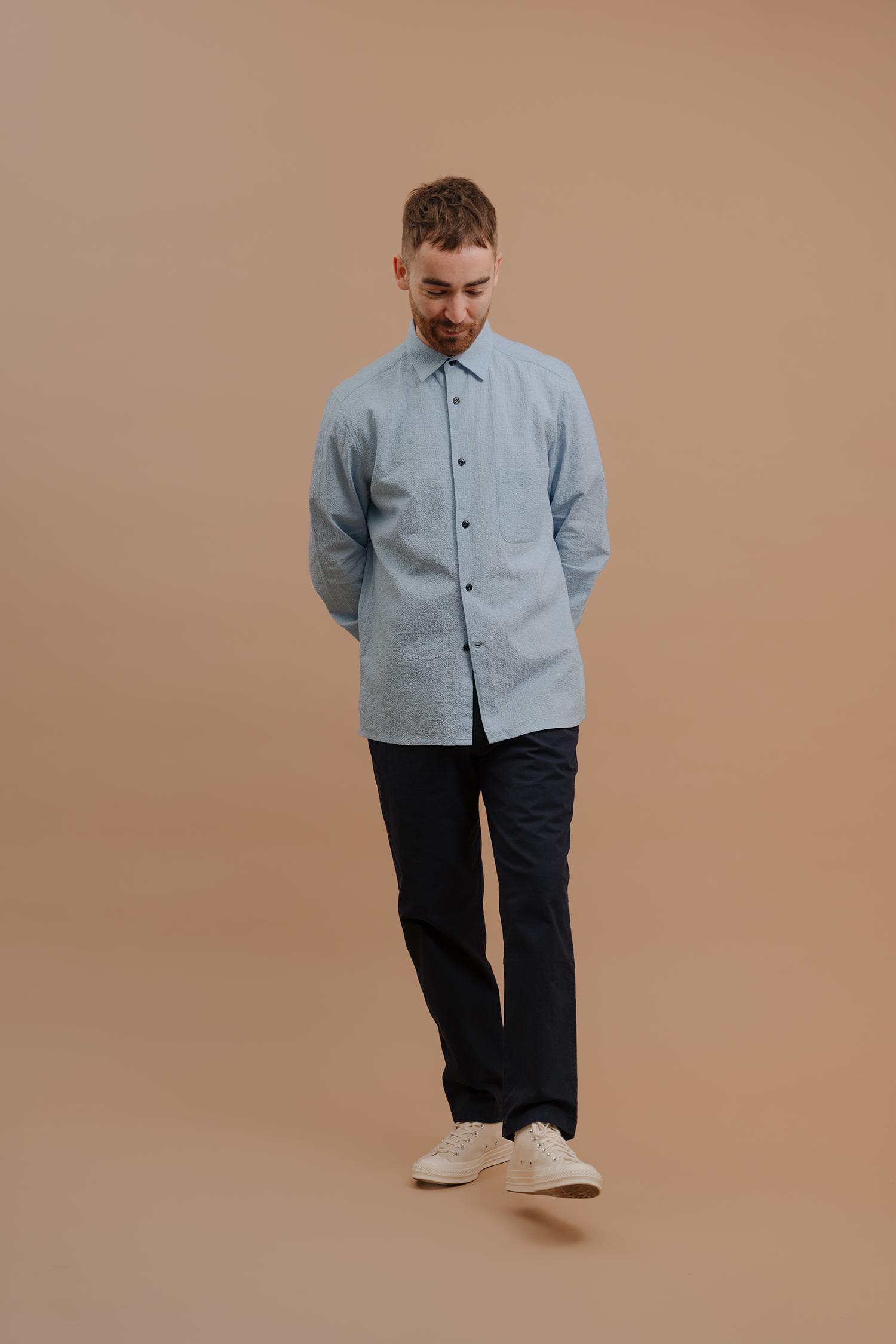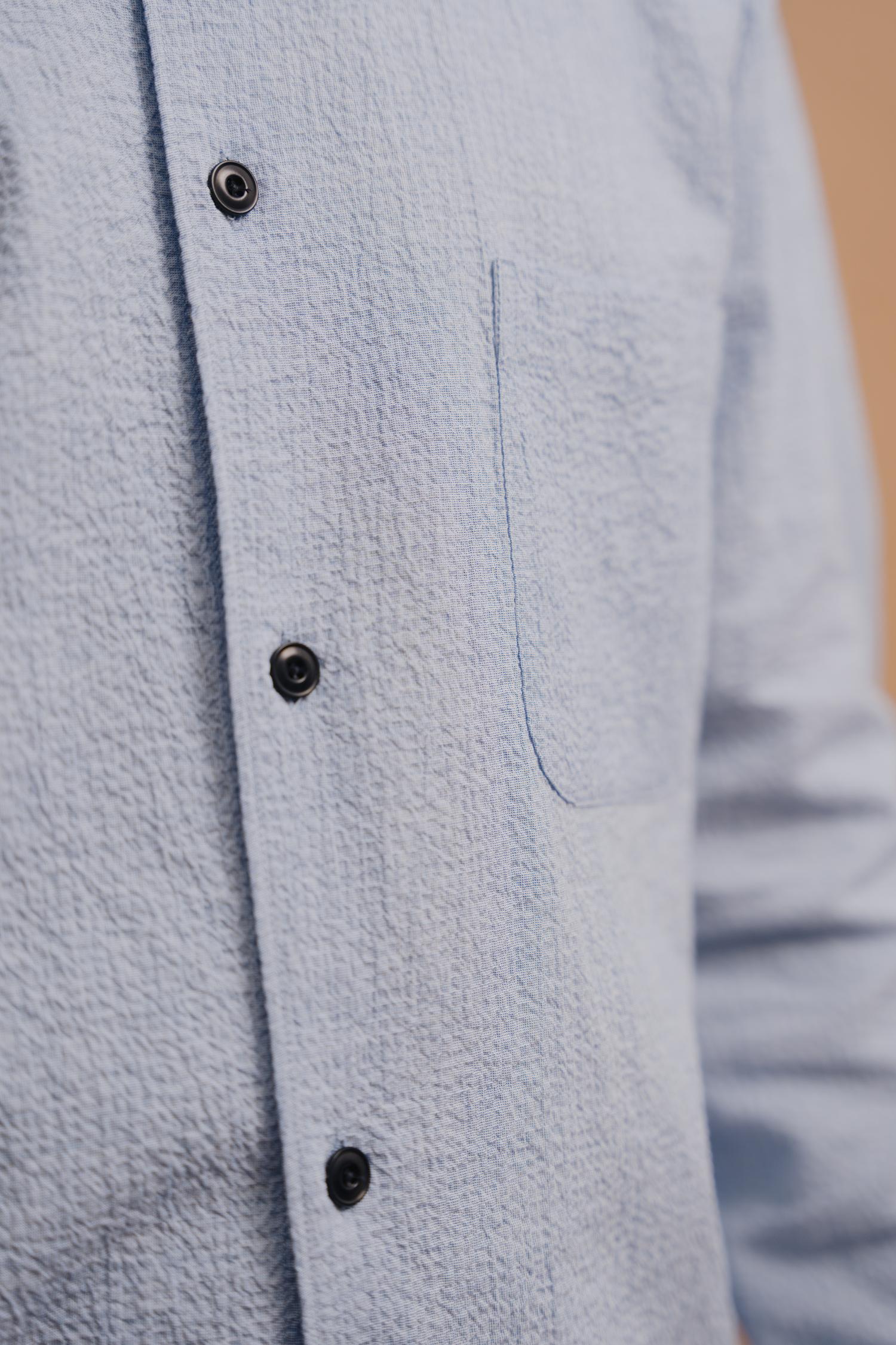 Expertly crafted in a luxurious, lightweight seersucker, the Essential Shirt is cut with a straight hem and vent in the side seam for a cleaner look. Modern, pared back design with a minimal, french-front placket, jet chest pocket, unfussy and lightly fused collar, and finished with sustainable corozo nut buttons. We'v