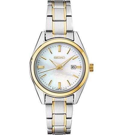 From Seiko, the Womens Essential Quartz Analog Mother-of-Pearl Dial Two Tone Stainless Steel Bracelet Watch features: Two-tone stainless steel case and braceletMother-of-pearl dialDate calendarLumiBrite handsSapphire crystalLink/clasp closureQuartz analog movementCase diameter approx. 29.8 mmWater Resistance: Up to 10 bar, 100 meters (330 feet)Imported.