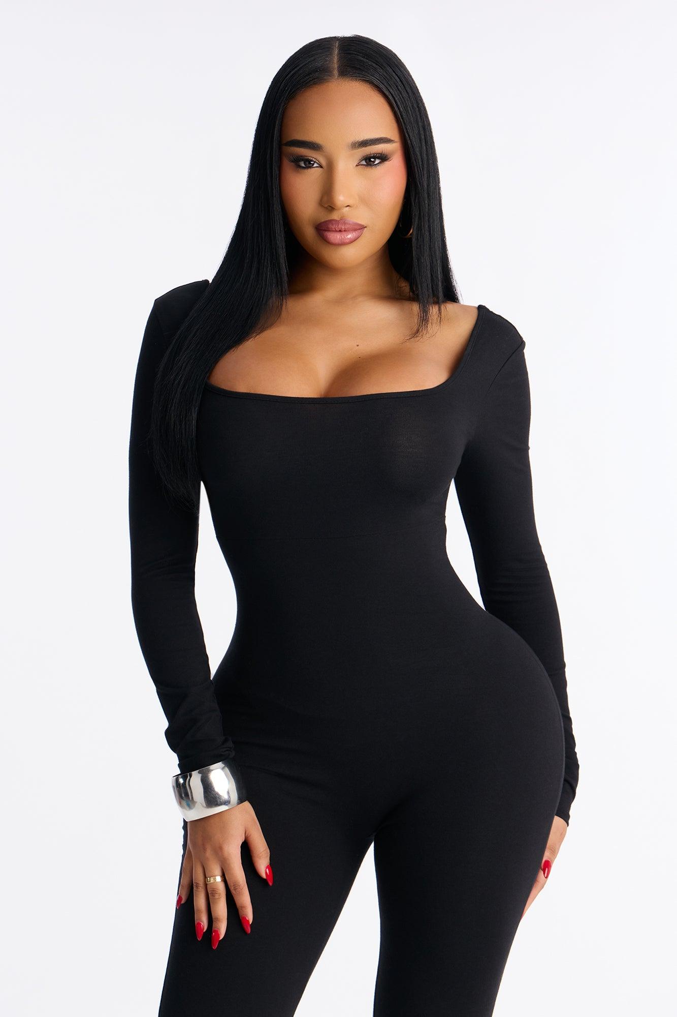 Available In Black And Chocolate. Jumpsuit Stretch Long Sleeve Square Neck Flare Leg 34" Inseam Self: 87% Cotton 13% Spandex Imported